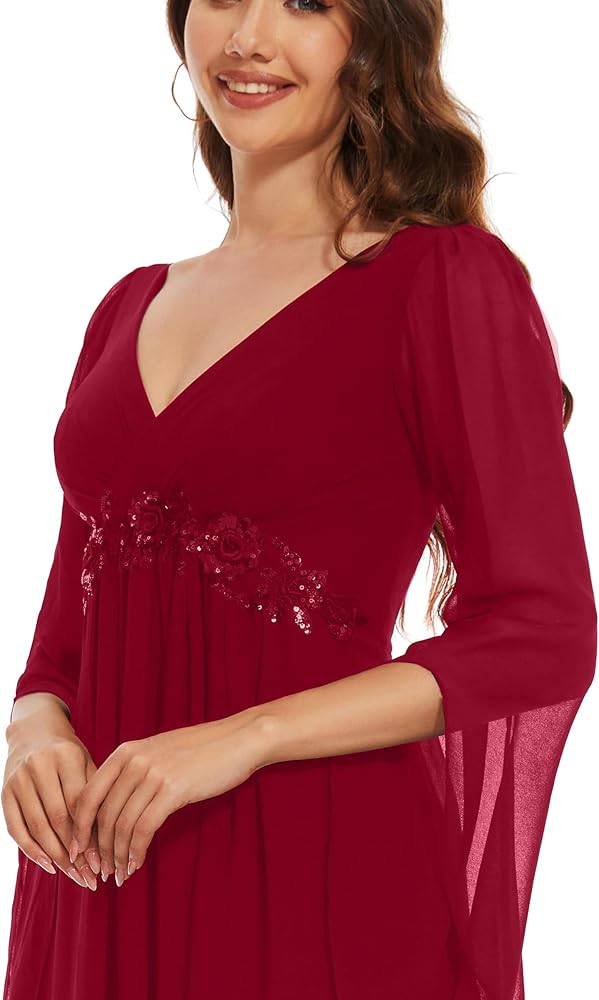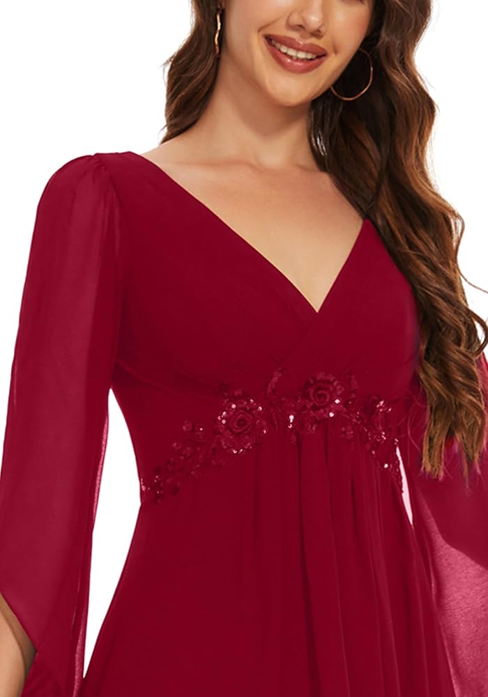 جذاب لجميع أنواع الجسم: مصمم ليناسب جميع النساء ويجذبهن، بما في ذلك الأمهات الحوامل والنساء ذوات الأشكال الممتلئة، فستاننا مصنوع من قماش الشيفون المطاطي عالي الجودة. تخلق صورتها الظلية عالية الخصر، وخط العنق على شكل حرف V، وطيات الخصر تأثيرًا تنحيفًا يبرز منحنياتك.