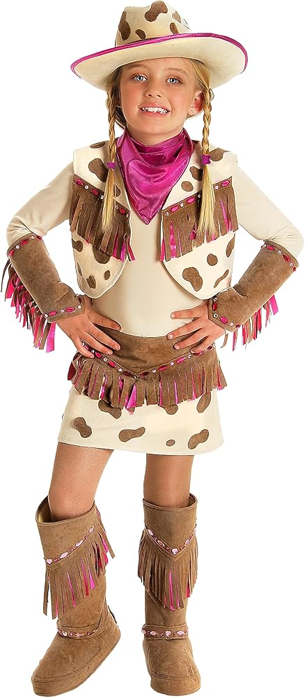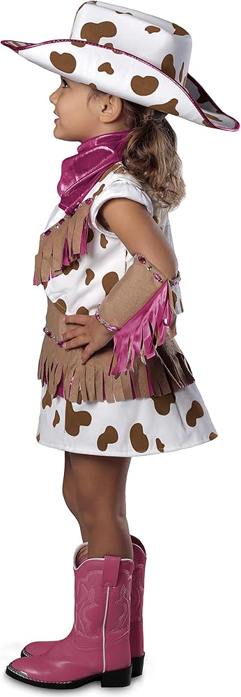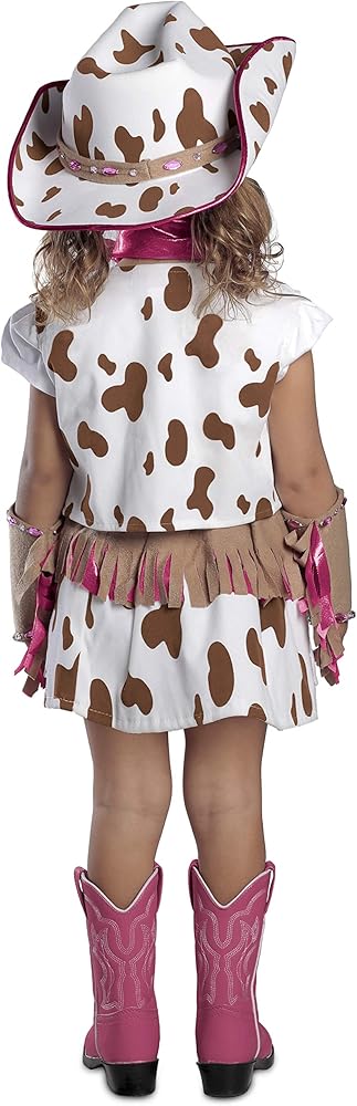 Get your child ready for the rodeo with the Child's Deluxe Rhinestone Cowgirl Costume! This costume comes with a brown cow print vest, brown cow print skirt, faux suede armbands, and pink neckerchief. If you are wondering where the rhinestones come in they are intricately placed in a beautiful design through out the costume! You'll be lassoing a winning costume with the Child's Deluxe Rhinestone Cowgirl Costume.