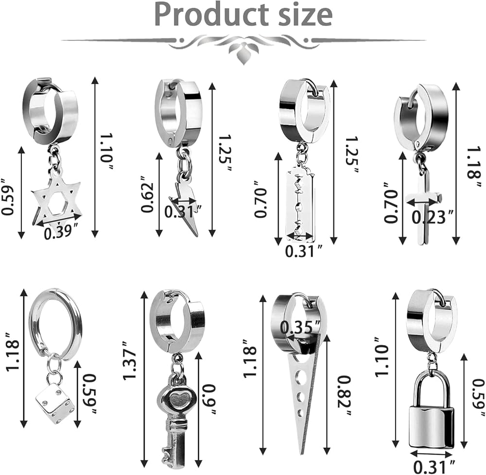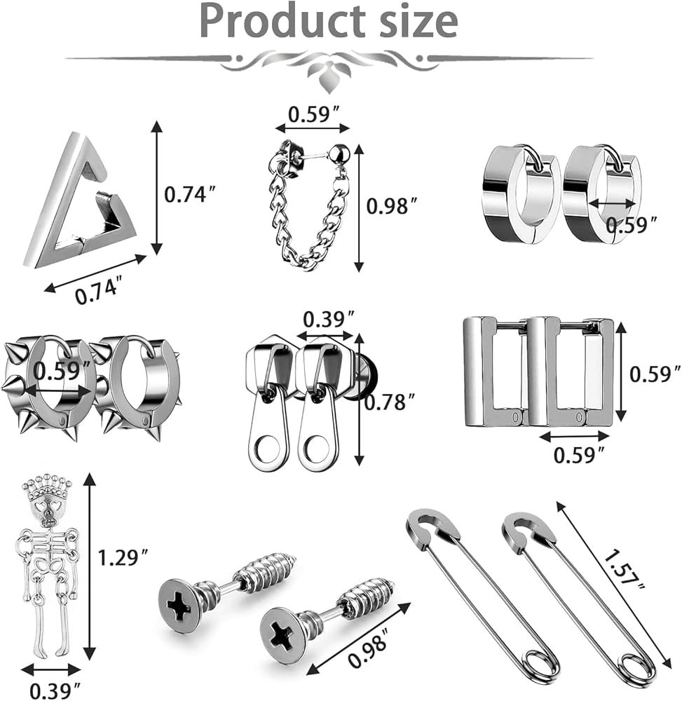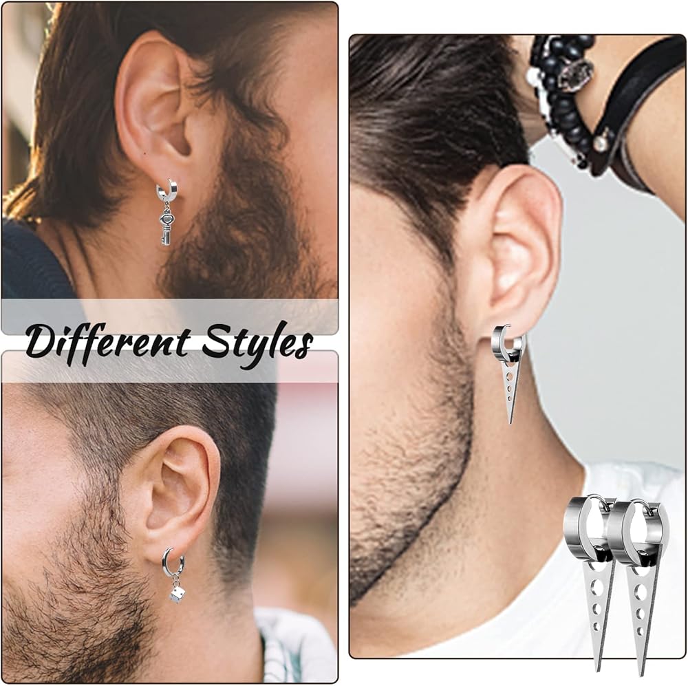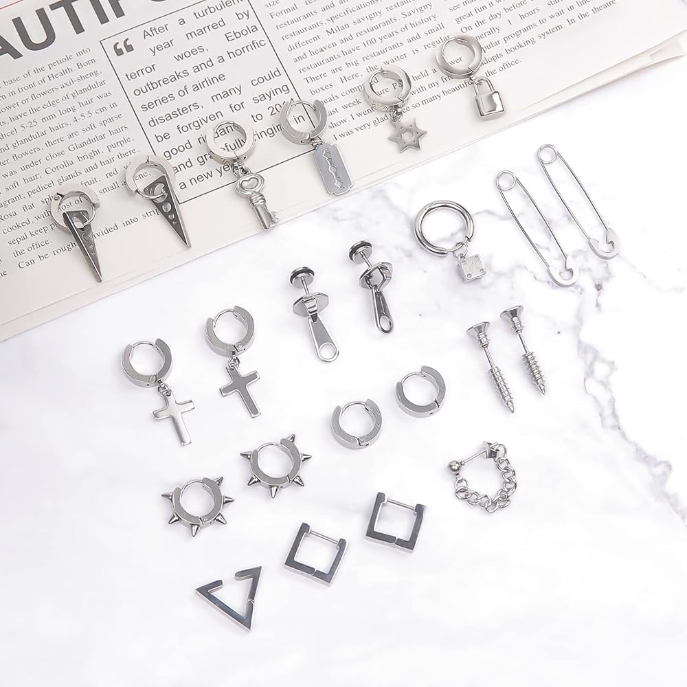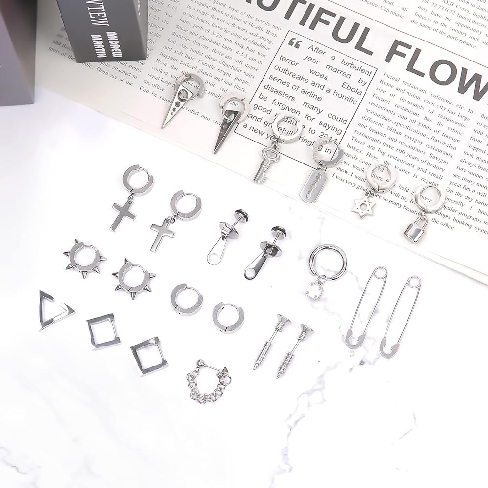 🌟26 قطعة من الأقراط الرجالية🌟- سوف تحصل على مجموعة مكونة من 17 تصميمًا مختلفًا من الأقراط، بما في ذلك الأقراط المرصعة والأقراط المتدلية، بالإضافة إلى عناصر الموضة مثل مشابك الورق والأقفال والصلبان والهيكل العظمي والسحابات والمسامير السلاسل. مجموعة متنوعة من الأقراط السوداء بأشكال مختلفة يمكن أن تلبي جميع احتياجاتك في الارتداء