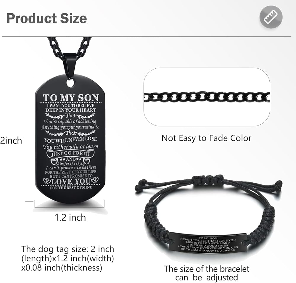 【SIZE】:The son bracelet is woven style, the size can be adjusted, and suitable for any people. Dog tag necklace: 1.93 inch× 1.1 inch× 0.08 inch. Curb Chain length: 20 inch