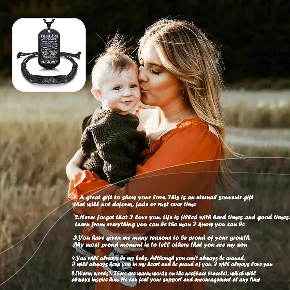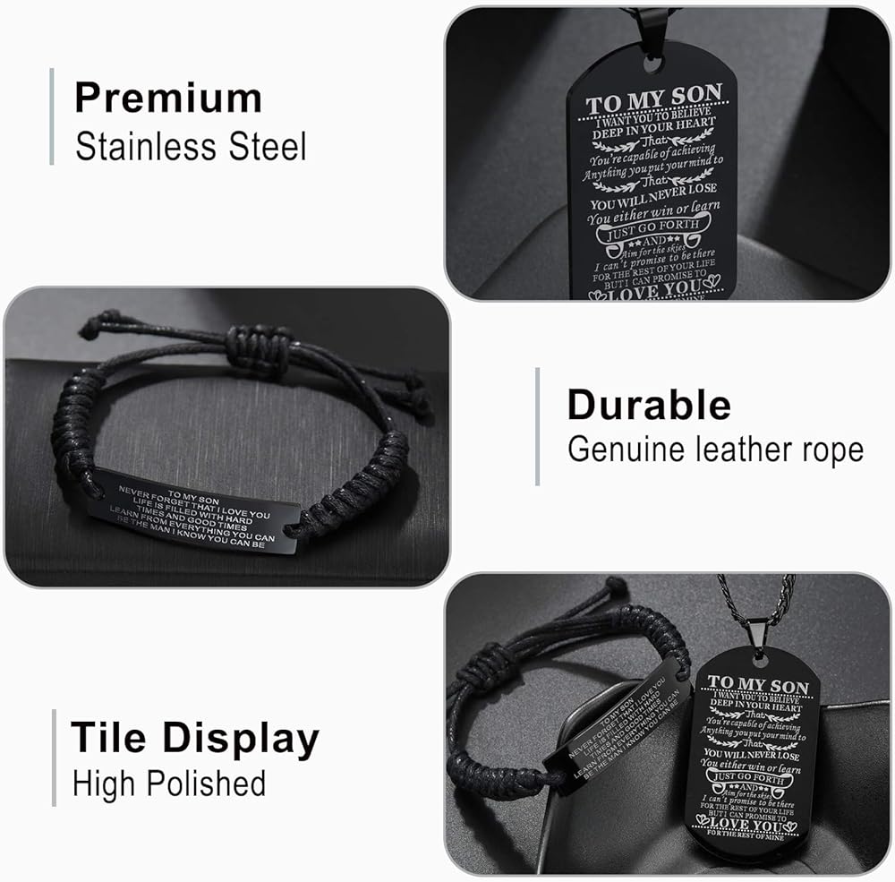 【PACKAGE】A to my son bracelet and a dog tag necklace with a lovely message card to your son from mom and dad. "Never Forget How Much I Love You" show your son your love and support and as a surprise to remind him how much you care about him.
