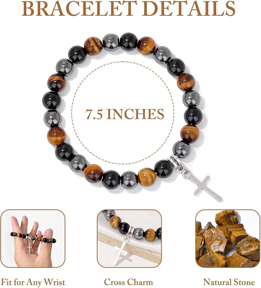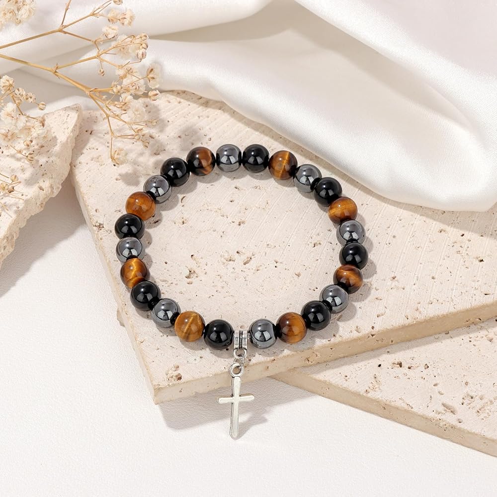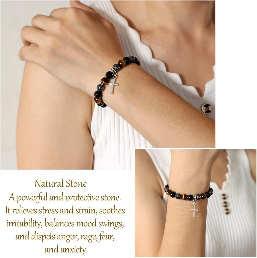 سوار حماية ثلاثي: استغل قوة عين النمر والعقيق الأسود والهيماتيت للحماية من السلبية وتعزيز القوة الداخلية. الشجاعة من عين النمر، والحماية من حجر السج الأسود، والثبات العاطفي من العقيق الأسود تتحد لتكوين السوار لتحقيق التوازن والحماية الكاملة.