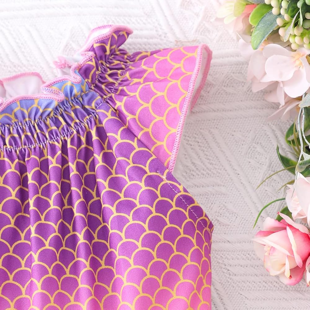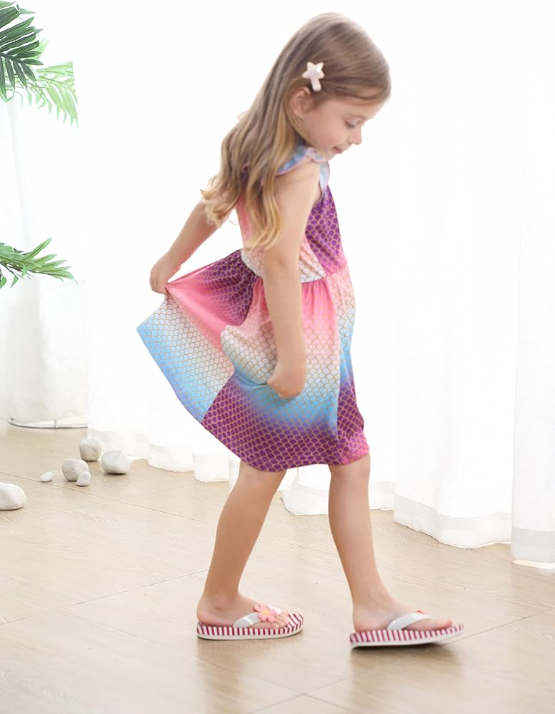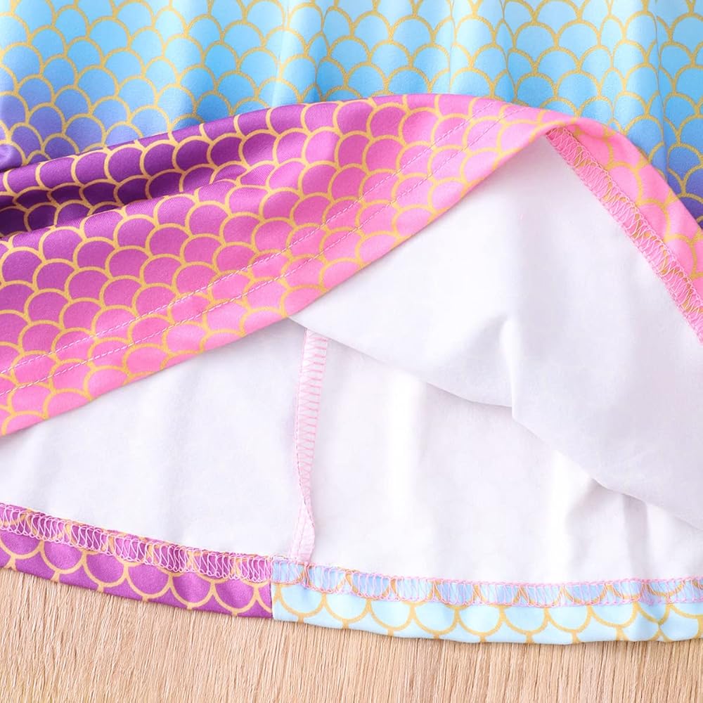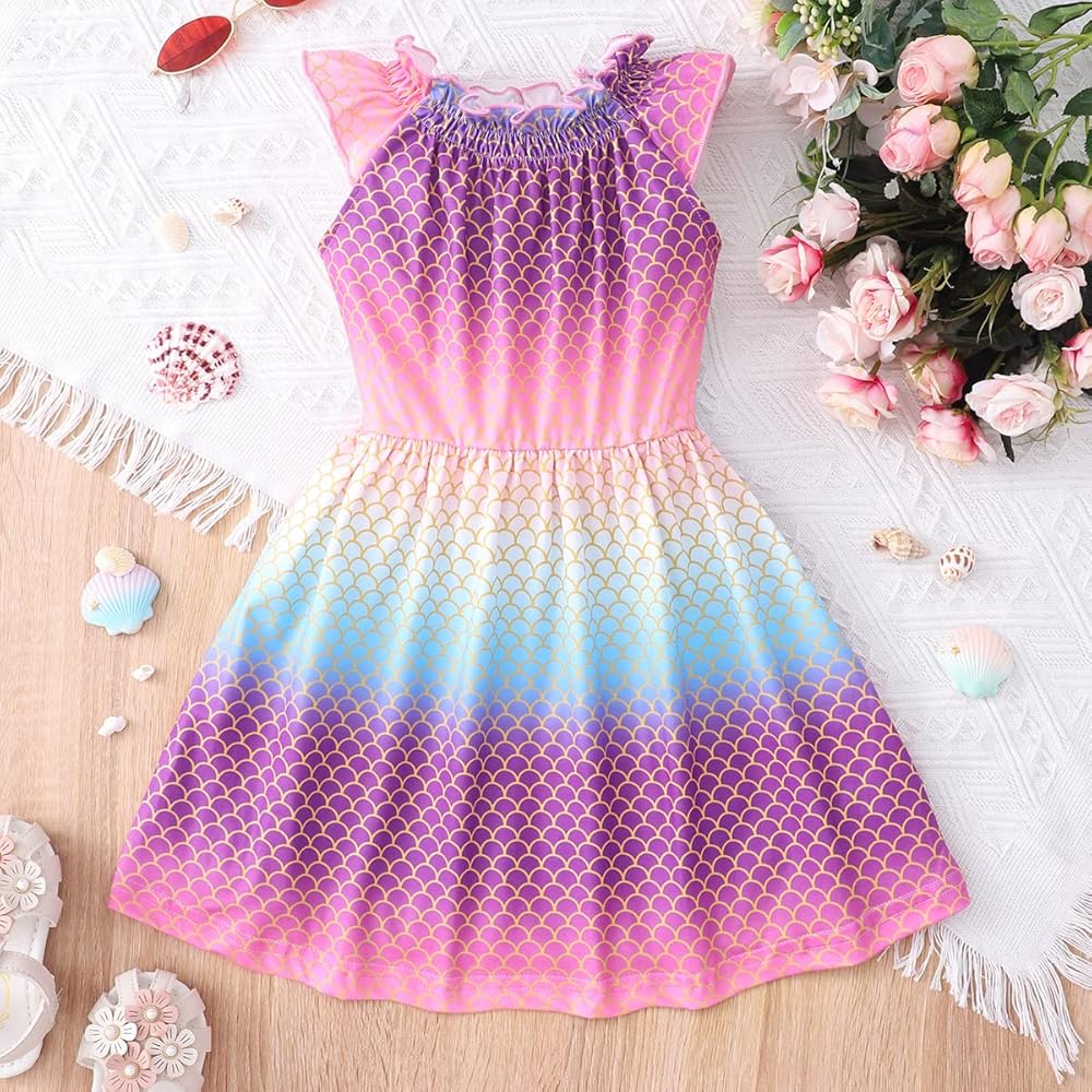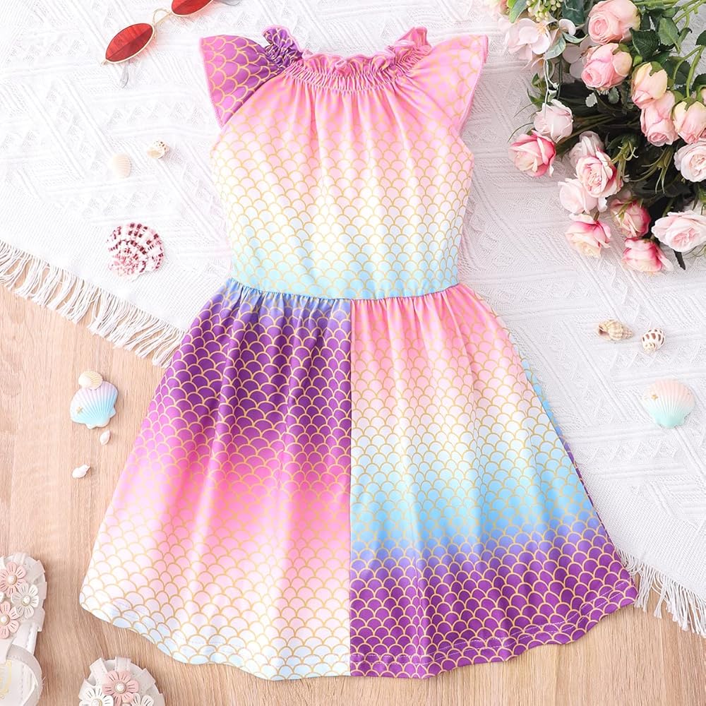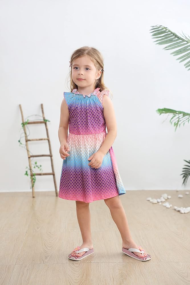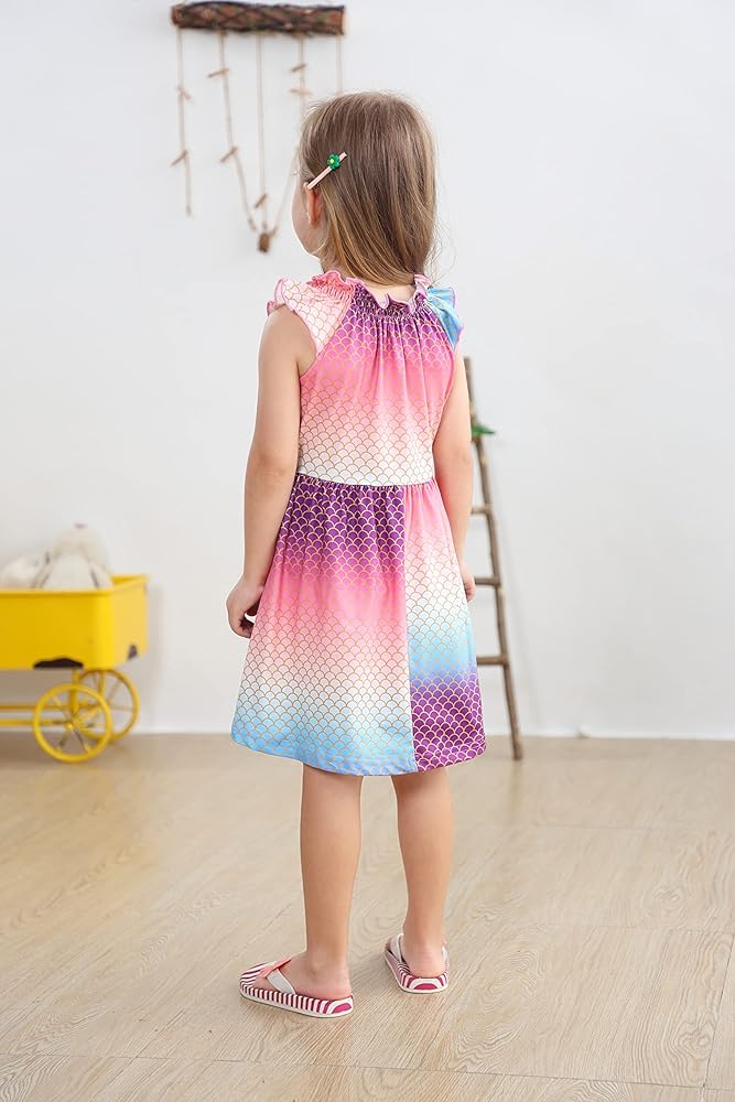 تتميز فساتين الفتيات بوجود وحيد القرن الكرتوني اللطيف، ديناصور، خنفساء، طباعة حورية البحر، مكشكشة، بدون أكمام كاجوال، أساور مرنة، طول الركبة، خط على شكل حرف A، خصر مرن