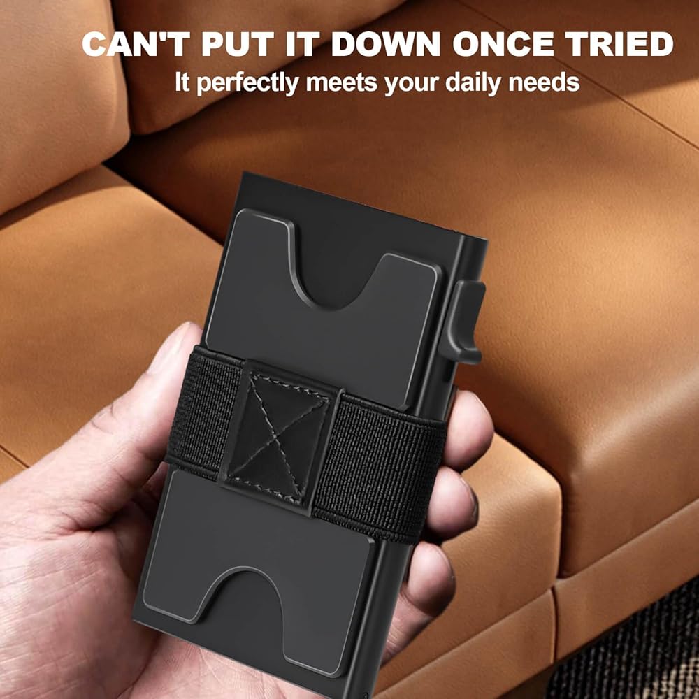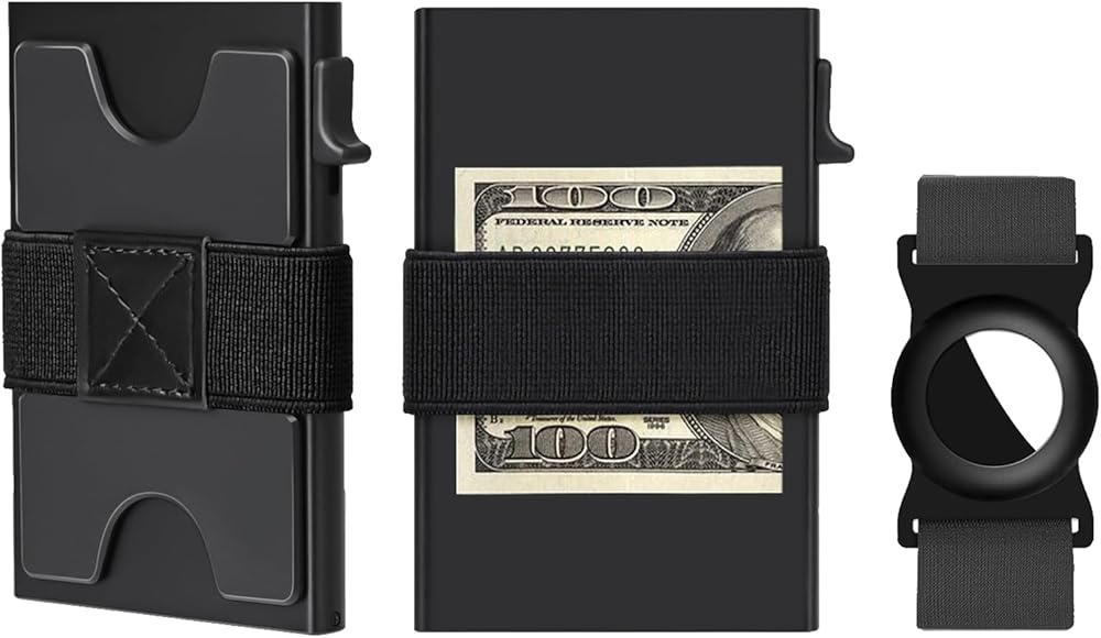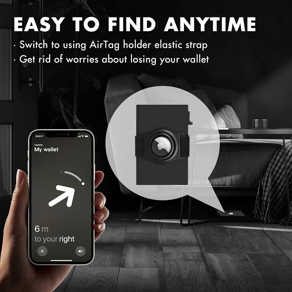 محفظة RFID Blocking AirTag للرجال - تصميم بسيط نحيف، تحمل أكثر من 12 بطاقة ونقود، محفظة معدنية سريعة الوصول مع حزام نقود مرن وحافظة بطاقة هوائية قابلة للفصل (أسود مشهور)