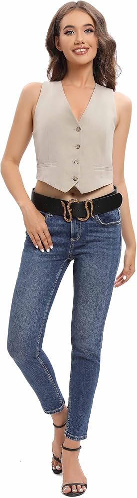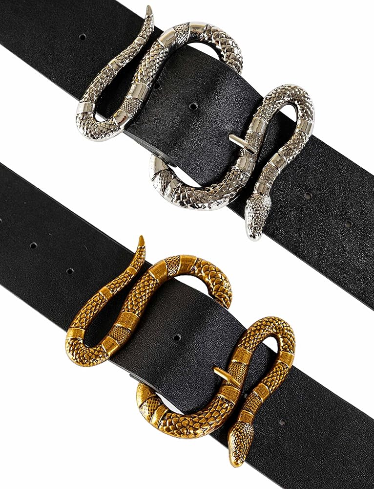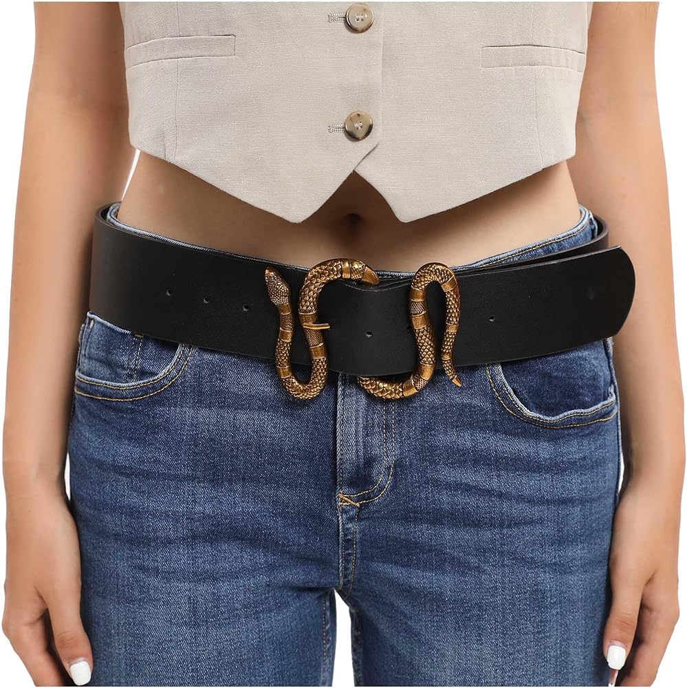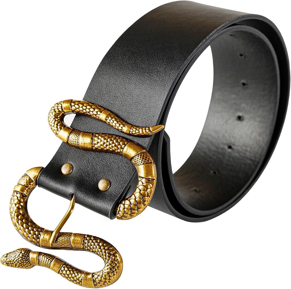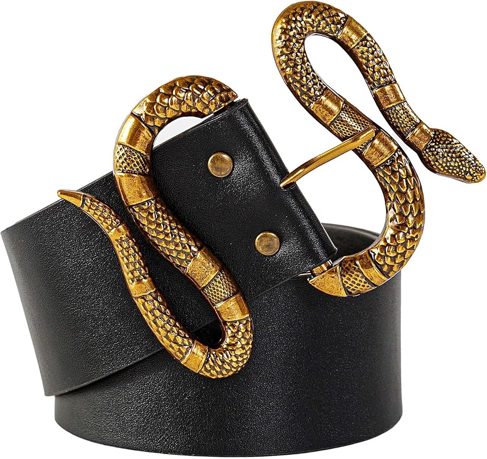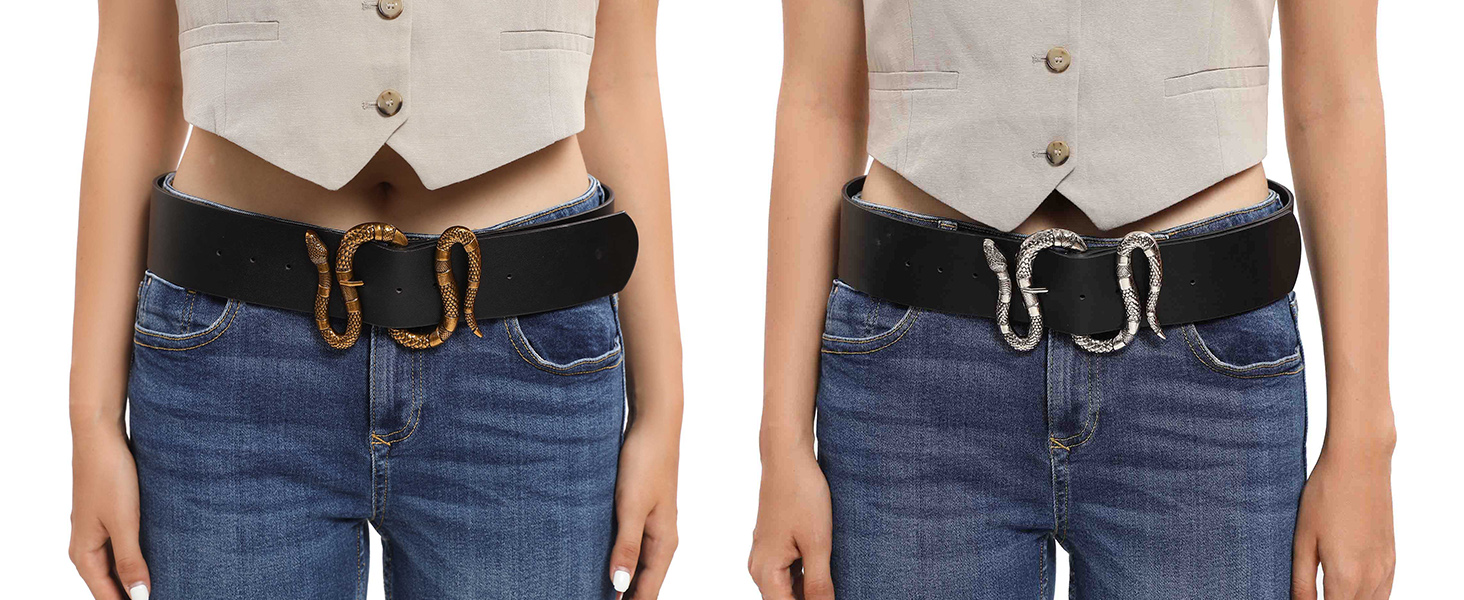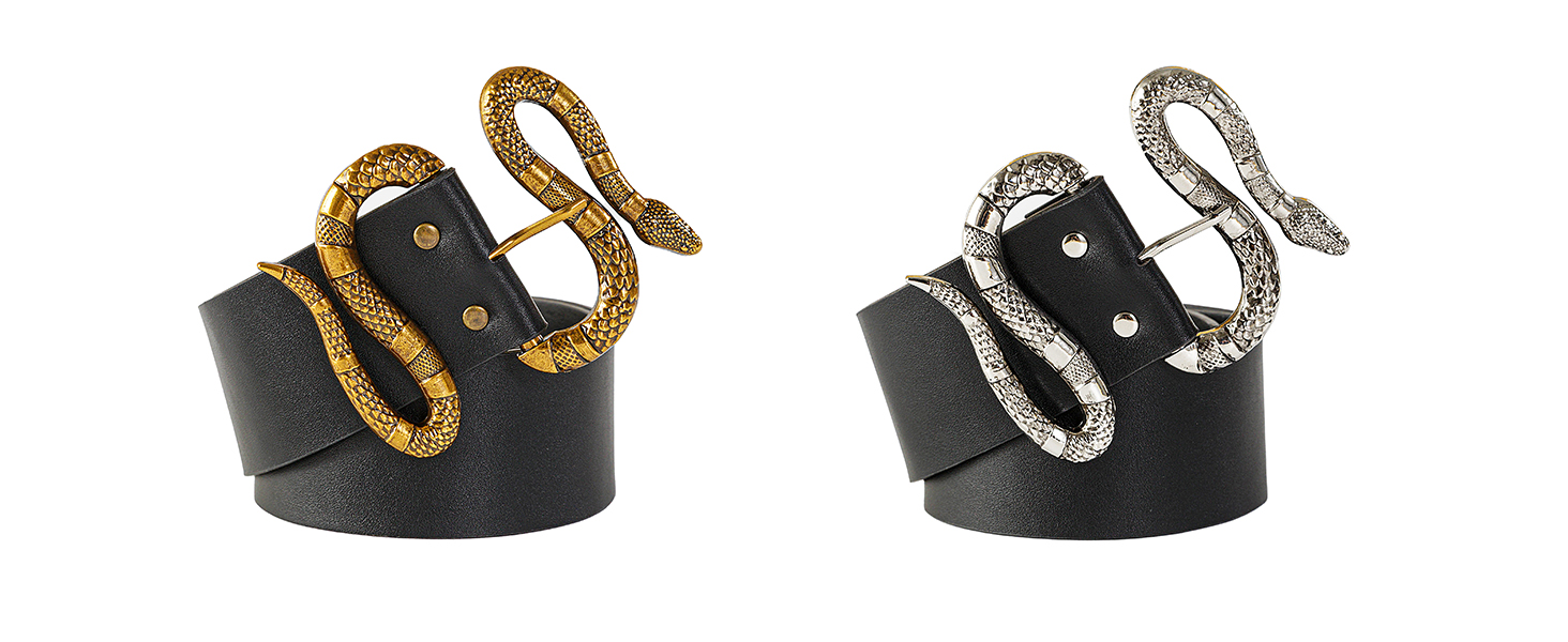 FAN&LOUIS حزام جلد الثعبان الأسود للنساء مع مشبك ثعبان ذهبي وفضي كبير لفساتين الجينز