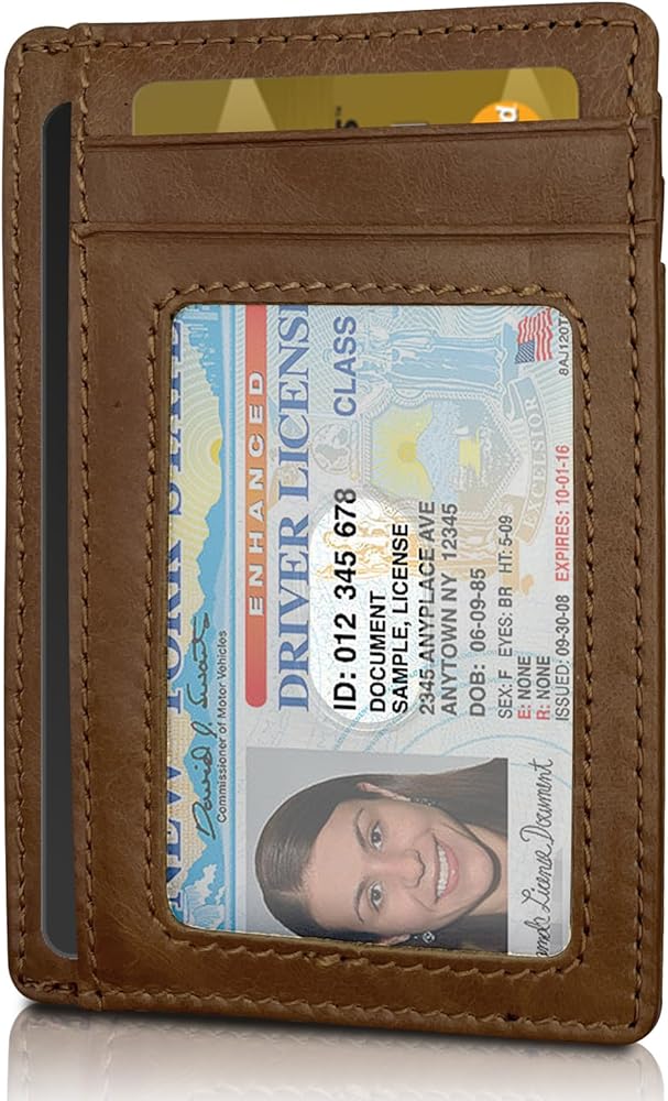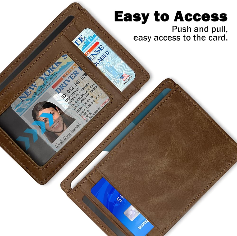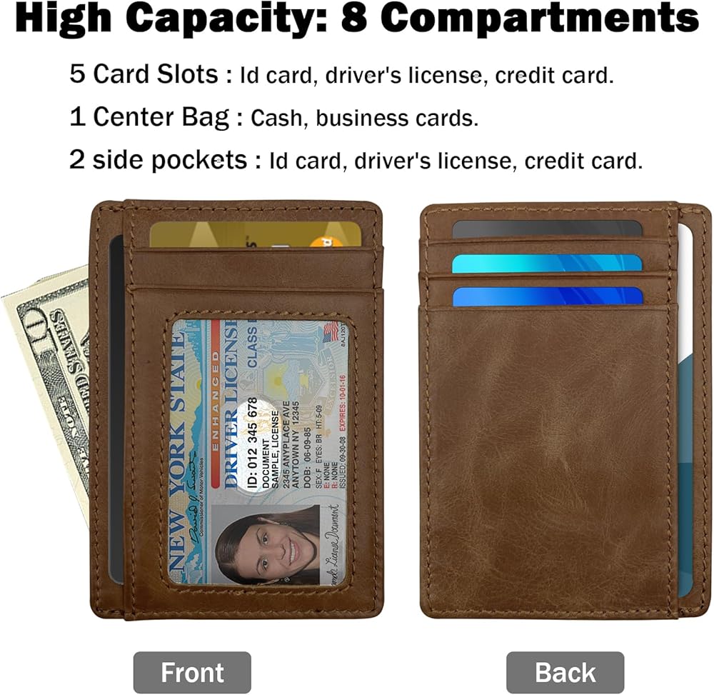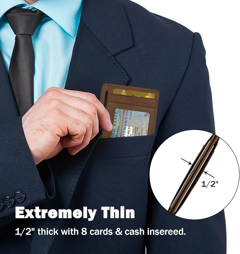 • [Unique style]: Minimalist wallet features 4 vertical slots, 2 horizontal slots, and 1 ID window. Horizontal pockets for credit cards and cash are extremely thin and easy to carry.