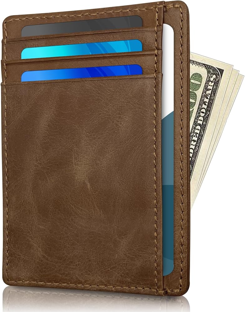 DEEZOMO RFID Blocking Wallet can secure your credit card and other RFID-chipped cards,ID,Passport etc., protects your personal information from being stolen.Blocking all RFID scanners and readers.Made from genuine Leather,waxed cotton thread,full grain leather,thick genuine leather,it is handcrafted without machine.A perfect slim case to hold your change,name card,bank card etc.The roomy interior can hold and protect your cards well,and it can be easily put in your pocket because of its slim figure.Sometimes you don't want to bring your handbag while you go out,okay,just put this slim wallet with your card in your pocket,you can go out now without any burden.