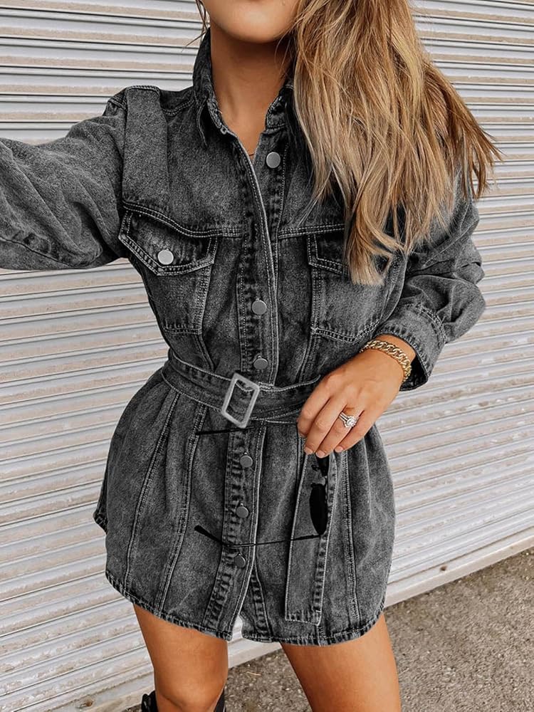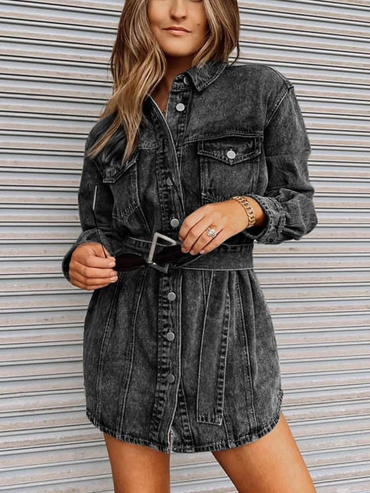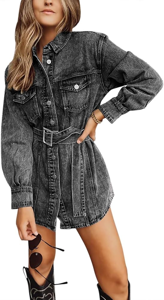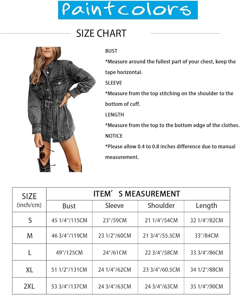 الميزات - سترة جينز طويلة الأكمام للسيدات تتميز بجيبين على الصدر من أجل الأناقة والعملية، وسترة قميص عصرية بأزرار لأعلى، وياقة طية صدر السترة. سترة جينز طويلة مع حزام لتشكيل محيط خصرك. سترة الجينز الكاجوال هي قطعة أساسية في خزانة الملابس.