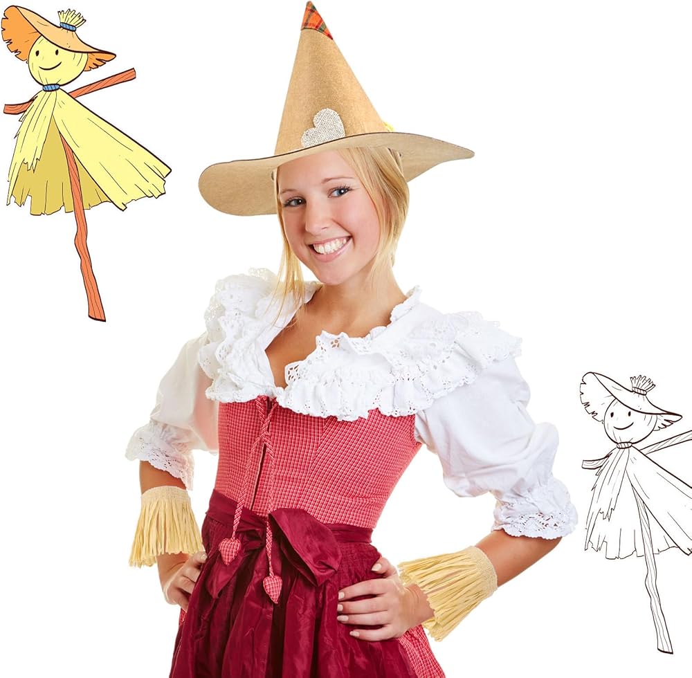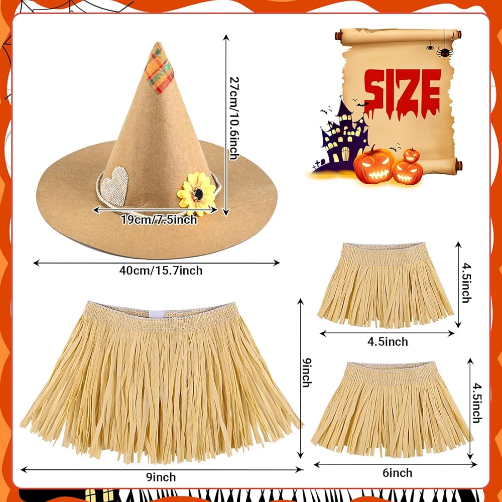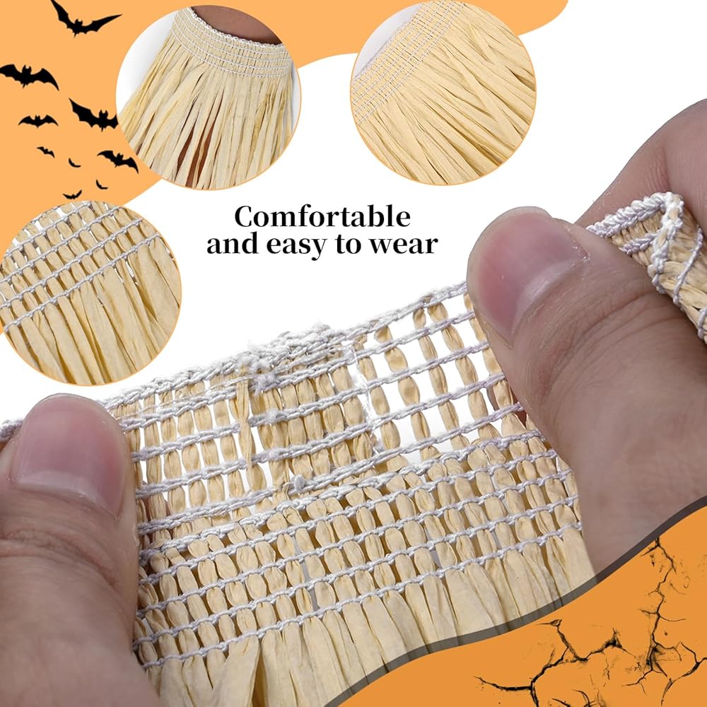 Complete Accessories Kit: This costume set includes a scarecrow poncho, scarecrow hat, and a five-piece scarecrow straw kit. The straw kit consists of pieces for the neck, arms, and ankles, all made of high-quality raffia grass. With this complete accessories kit, you can easily transform into a scarecrow and create a festive atmosphere at any Halloween party.