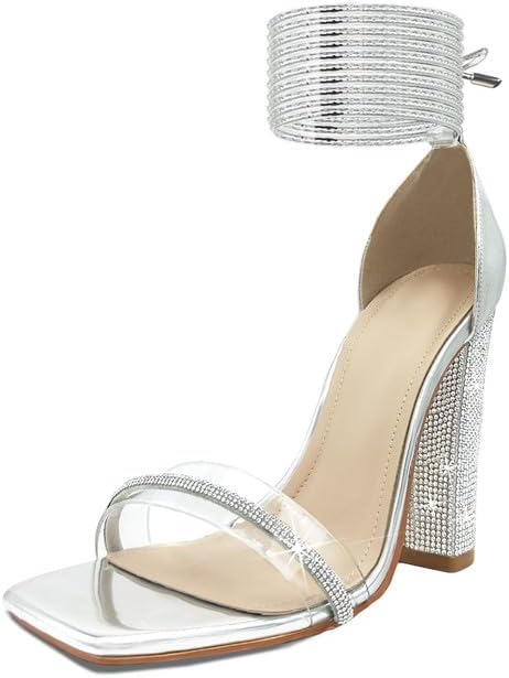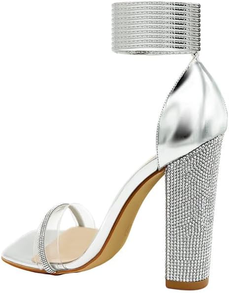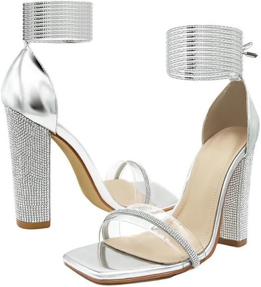 - شريط مذهل من أحجار الراين وصندل بكعب لامع 3.1 سم. أصابع قدم مربعة مفتوحة، مساحة أوسع لتناسب أصابع قدميك ونعلك.