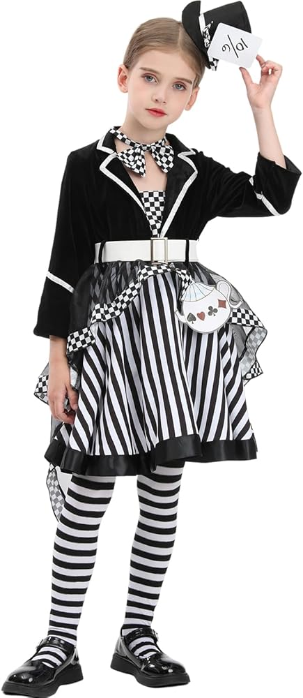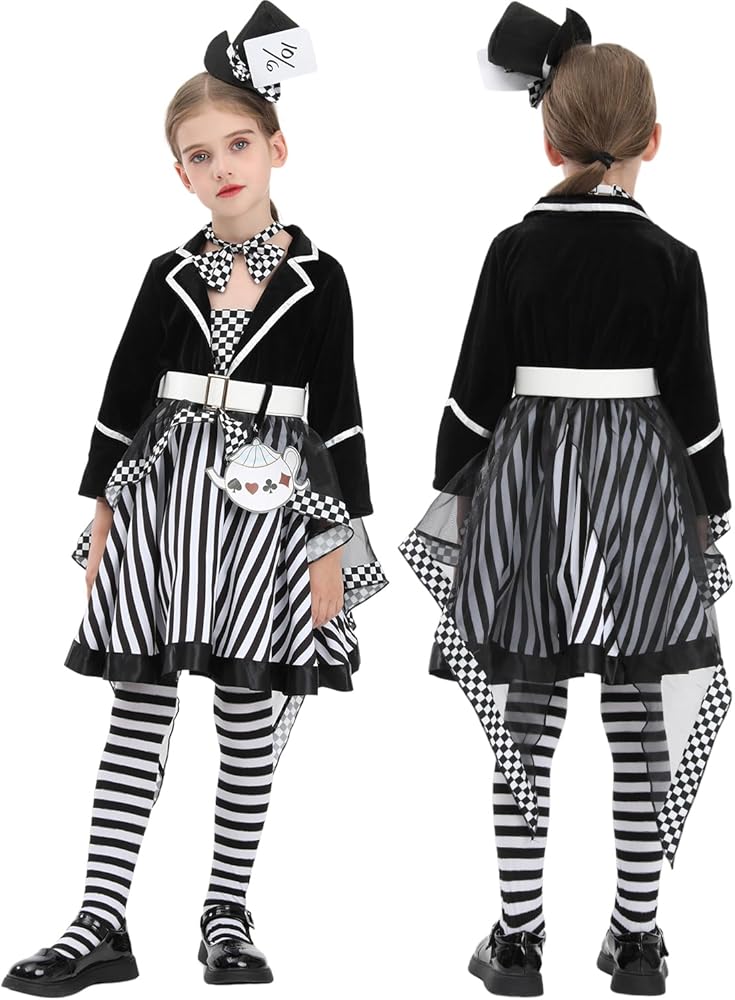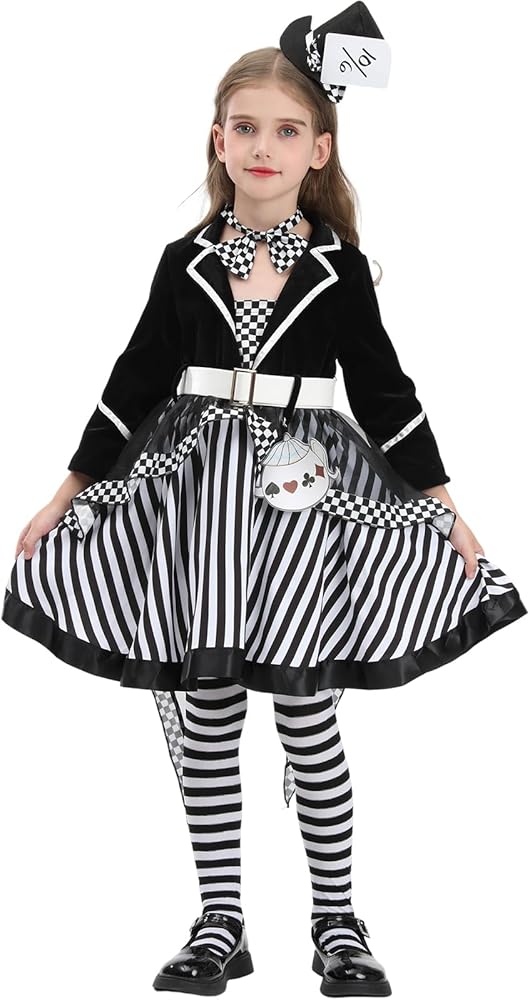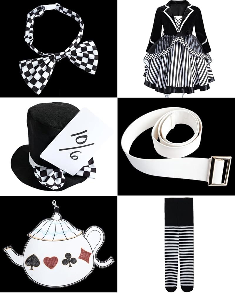 【مظهر أنيق وأنيق】: تصميم زي Mad Hatter الكلاسيكي، قبعة Hatter سوداء، فستان أسود وأحمر، جوارب مخططة باللونين الأسود والأبيض. يشبه فستان Mad مجموعة فساتين مكونة من 3 قطع. في الواقع، إنه فستان من قطعة واحدة، تم خياطة الجزء العلوي بأكمام طويلة وسترة حمراء وفستان على طراز توتو معًا في فستان من قطعة واحدة. يمنح هذا فتاتك مظهرًا رائعًا ومضحكًا، ويجذب انتباه الناس ويصبح مركز الاهتمام.