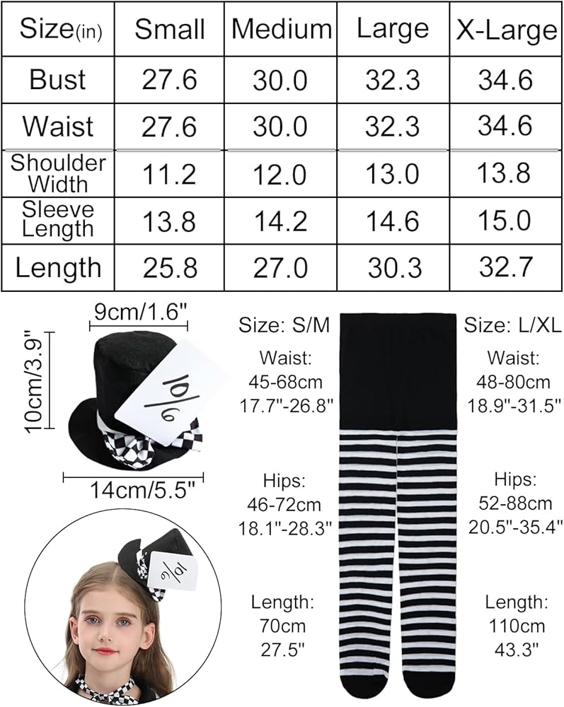 【المقاس وتنبيه إضافي】: هناك 4 مقاسات لفستان زي الهالوين ماد هاتر للفتيات، من S إلى XL. يرجى قراءة جدول المقاسات بعناية قبل الشراء، والسماح بخطأ يتراوح بين 0.39 بوصة إلى 1.18 بوصة بسبب القياس اليدوي. إذا لم تكن متأكدًا من المقاس، فلا تتردد في الاستفسار. من أجل الحفاظ على شكل وأسلوب مجموعة قبعة الهالوين ماد وفستان هاتر للفتيات، يوصى بالغسيل اليدوي بماء بارد أو دافئ، ويعلق ليجف، ولا يلف أو عصر. الحديد بدرجة حرارة منخفضة.