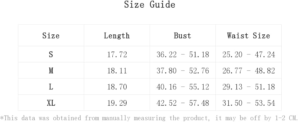 Small: Bust: 26-47.2", Length: 24/20.5", Waist Size: 25.2-37.8"