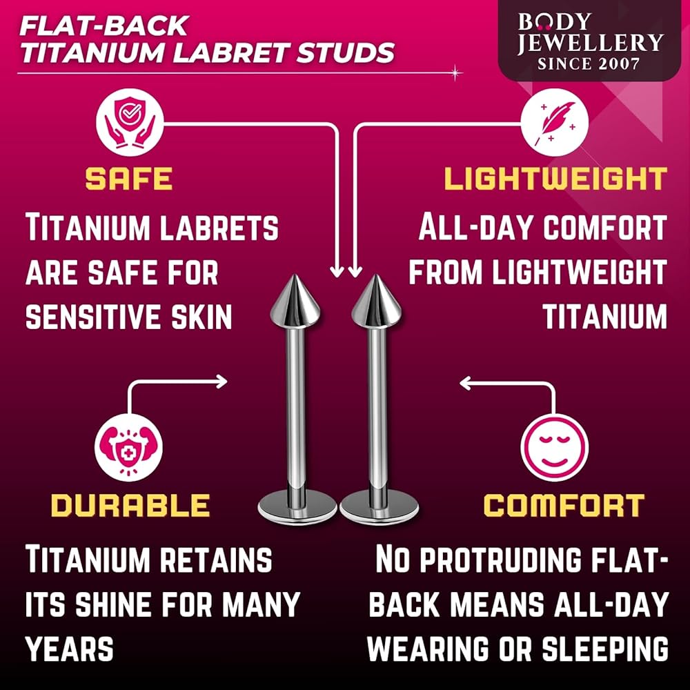 The implant grade titanium g23 is premium quality metal that best for your labret studs 16g titanium. It is LIGHTWEIGHT, DURABLE, CORROSION RESISTANCE, BIO-COMPATIBLE, LONG USE, GOOD FOR SENSITIVE SKIN.