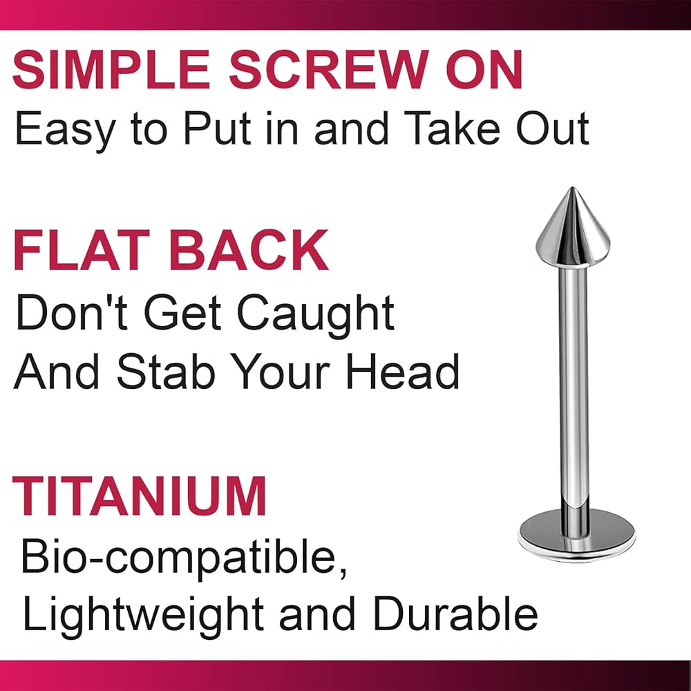 Our simplest plain style titanium labret stud cone spikes are easy to screw on, so they don't randomly fall out!