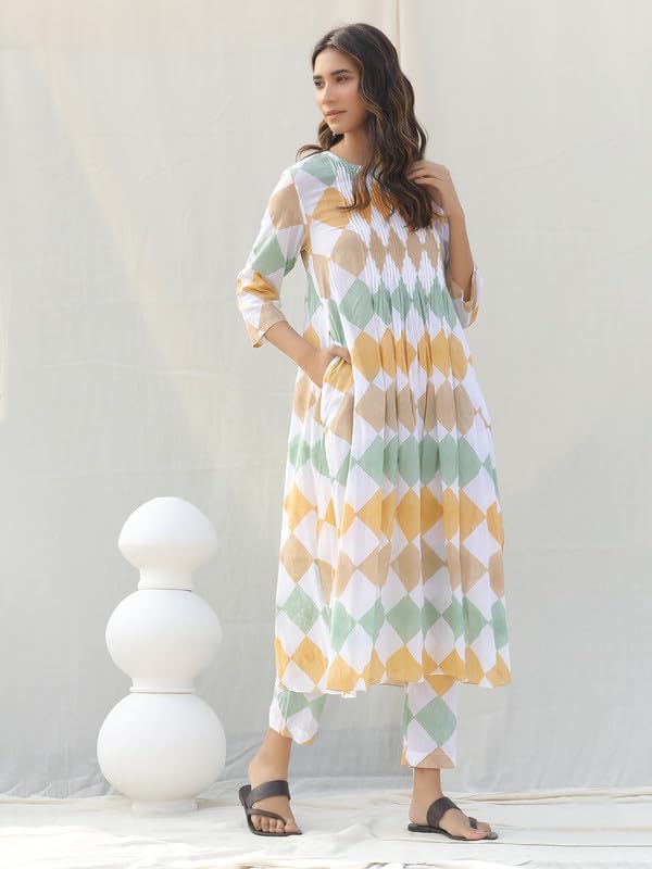 مجموعة كورتا ذا لوم مع بنطال للنساء بأكمام طويلة ملابس عرقية هندية ورقبة على شكل حرف V مطبوعة كورتي للبنات متعدد الألوان