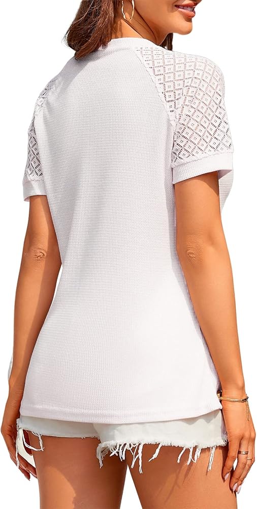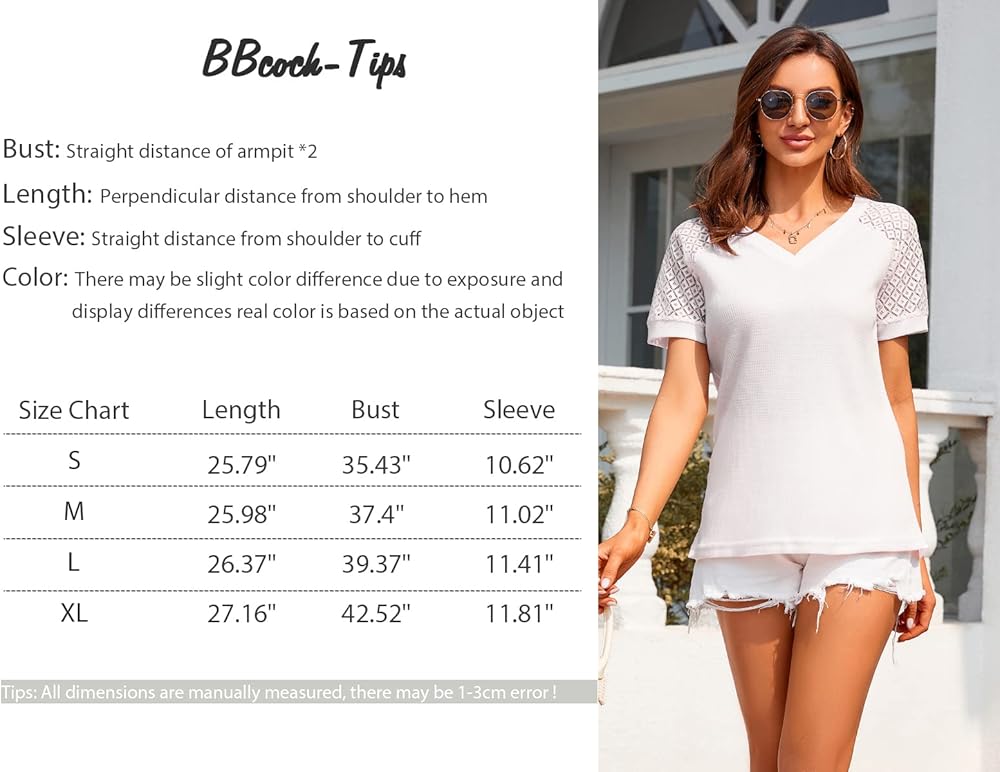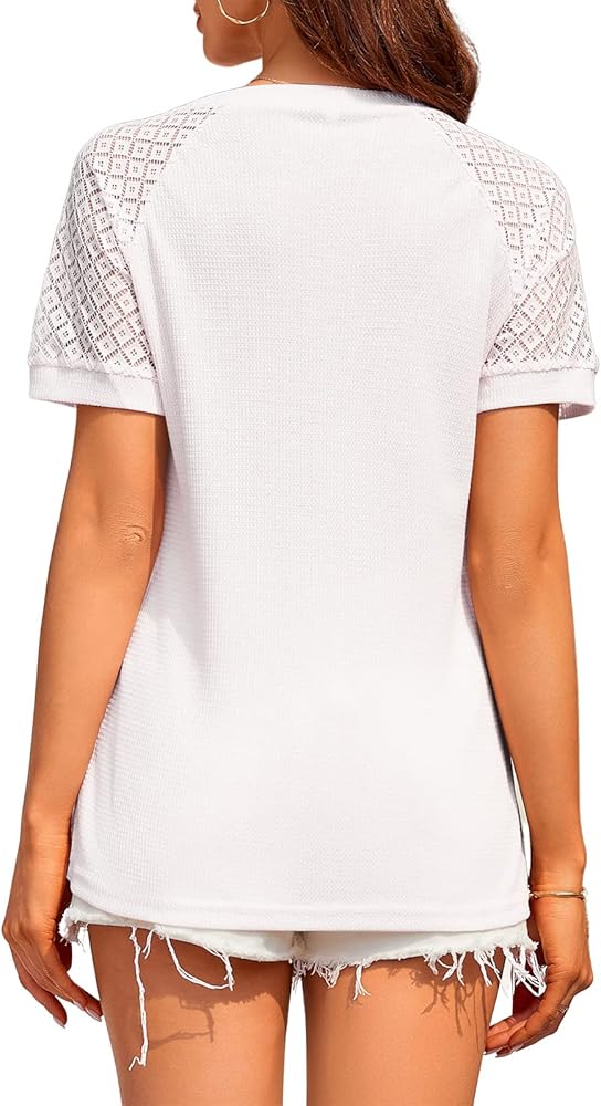 • Fabric-65% cotton 35% polyester. This lace short sleeve v neck t shirts for women is made of fabric which is elastic, breathable, lightweight, soft and durable