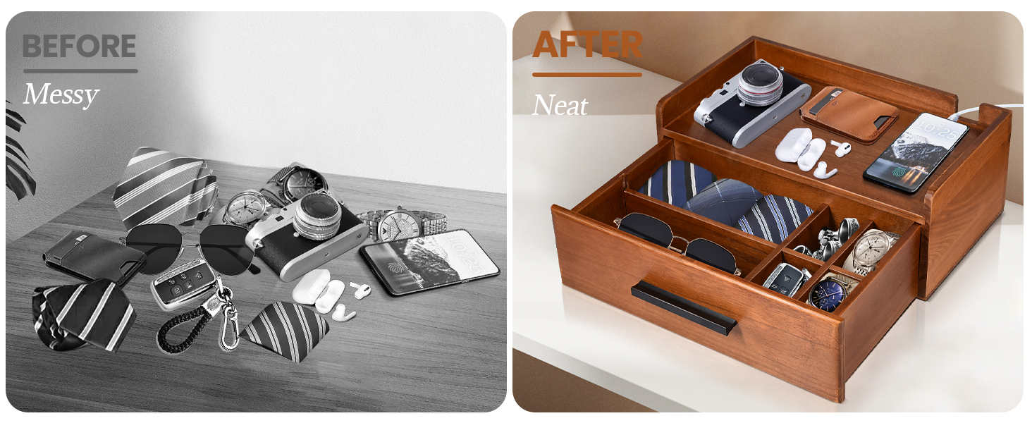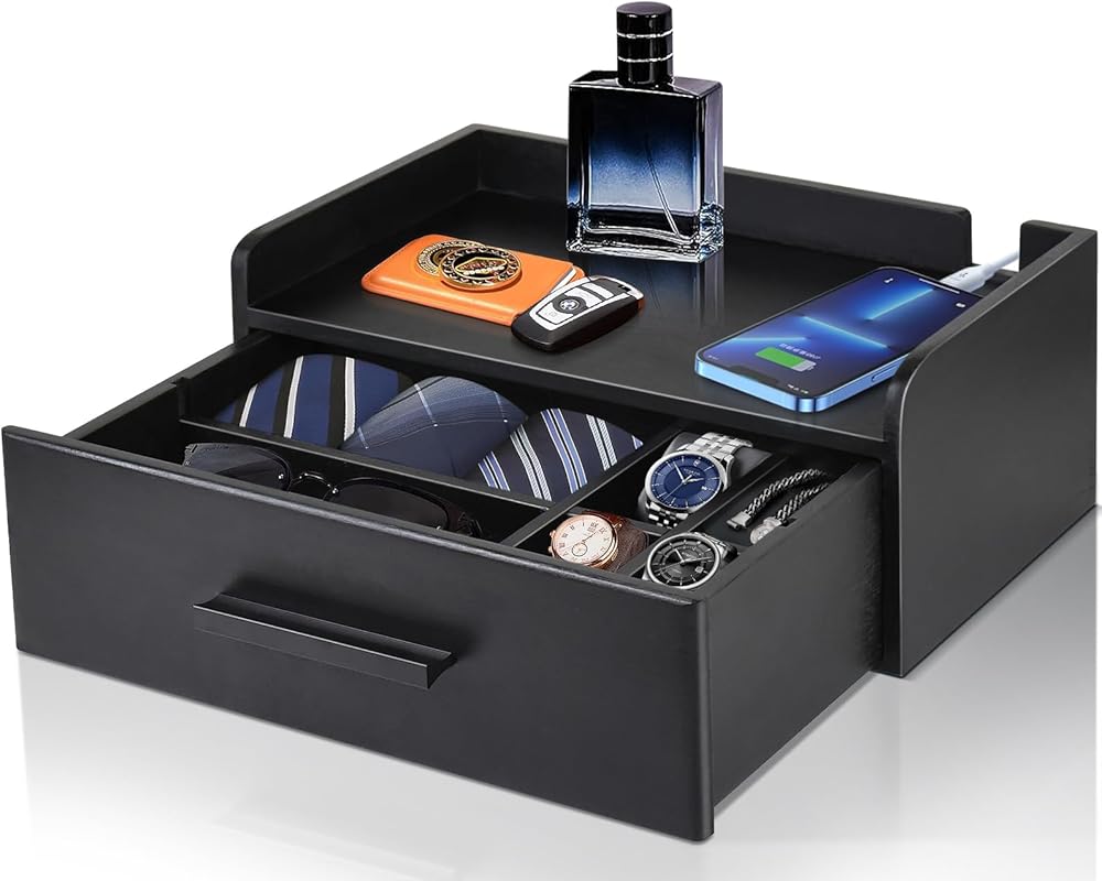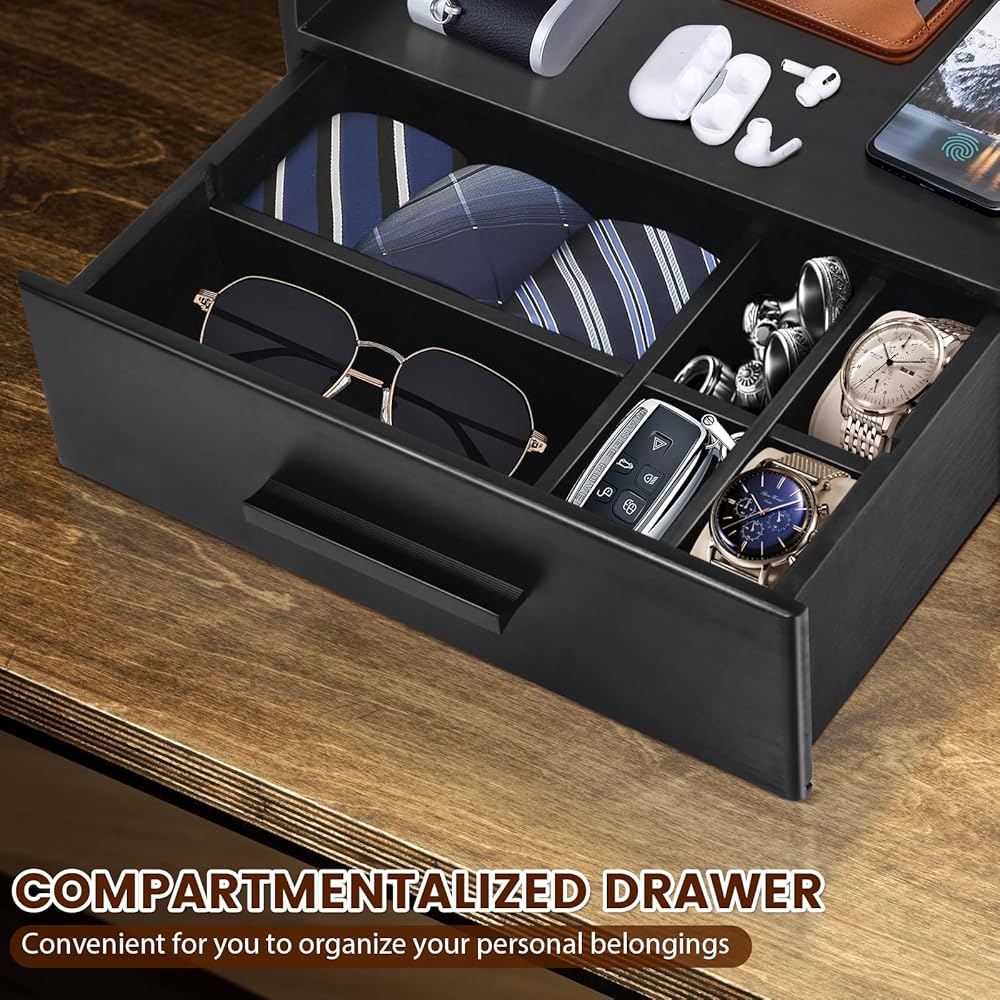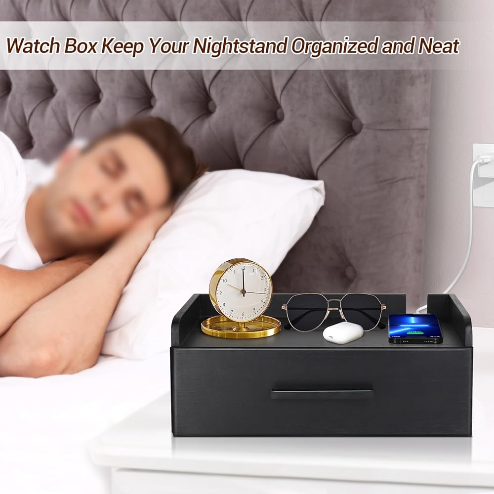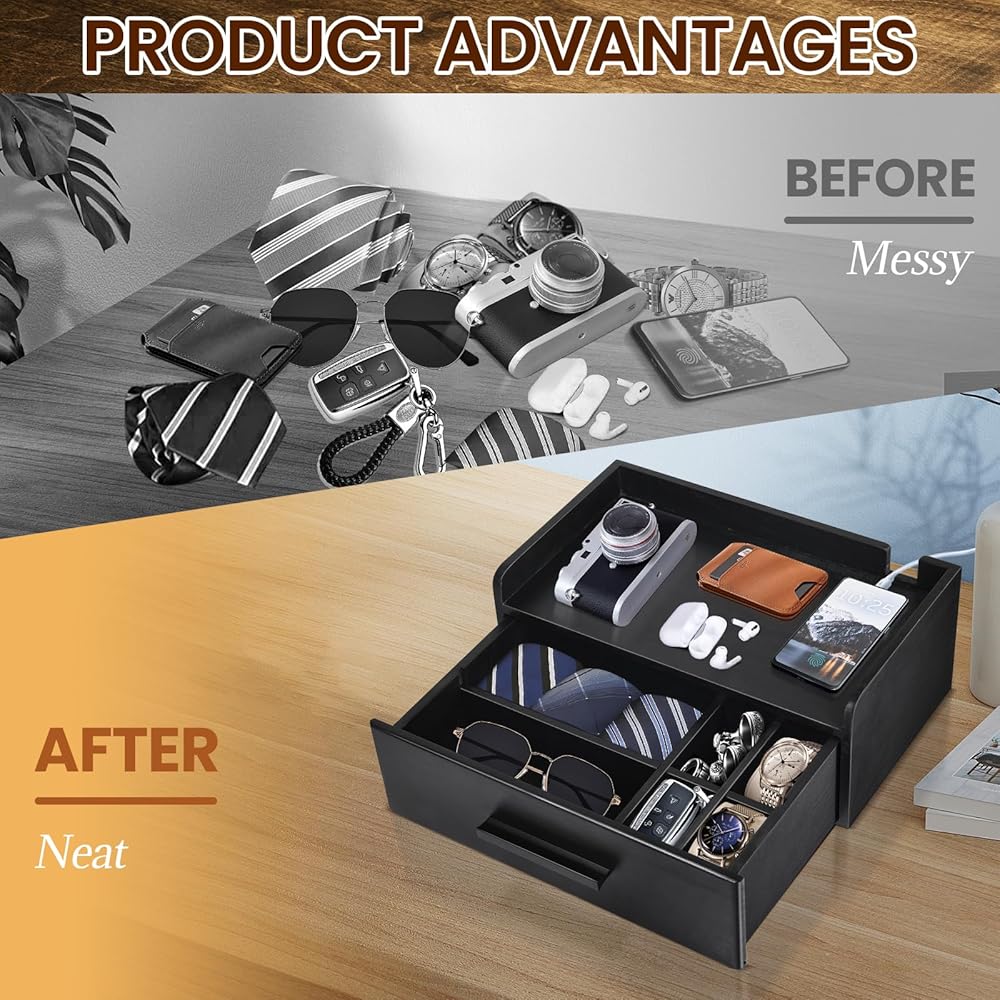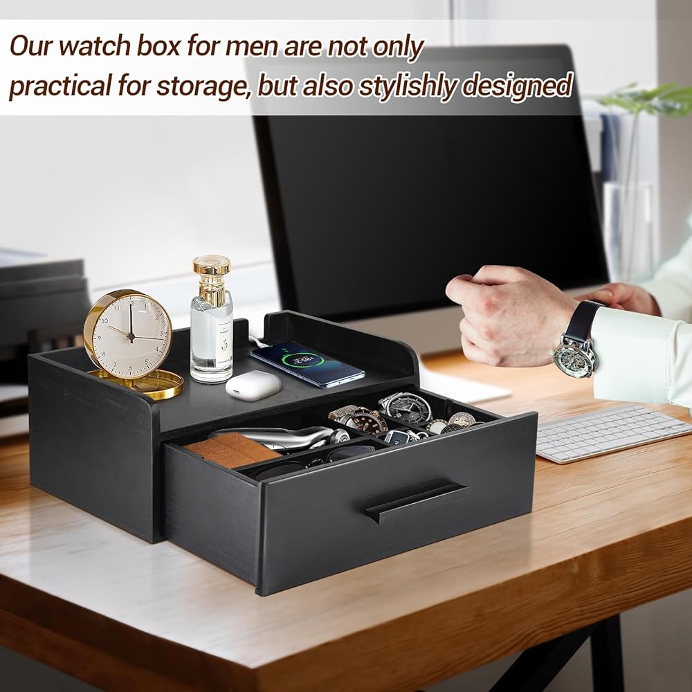 ⌚【سعة تخزين كبيرة】 يتميز صندوق الساعة الخاص بنا بتصميم مزدوج الطبقة. يمكن للطبقة العلوية أن تحمل مجموعة متنوعة من العناصر اليومية الصغيرة، مثل الهواتف وسماعات الرأس والمفاتيح. وهي مجهزة أيضًا بفتحة أسلاك لشحن أجهزتك الإلكترونية في أي وقت. يتميز الدرج السفلي لمنظم صندوق الساعات للرجال بمساحة داخلية واسعة تم تقسيمها بعناية لتخزين الساعات والقلائد وربطات العنق والنظارات الشمسية. تساعدك علبة صندوق الساعة لدينا في العثور بسرعة على الملحقات المناسبة، مما يوفر وقتك في الصباح المزدحم.