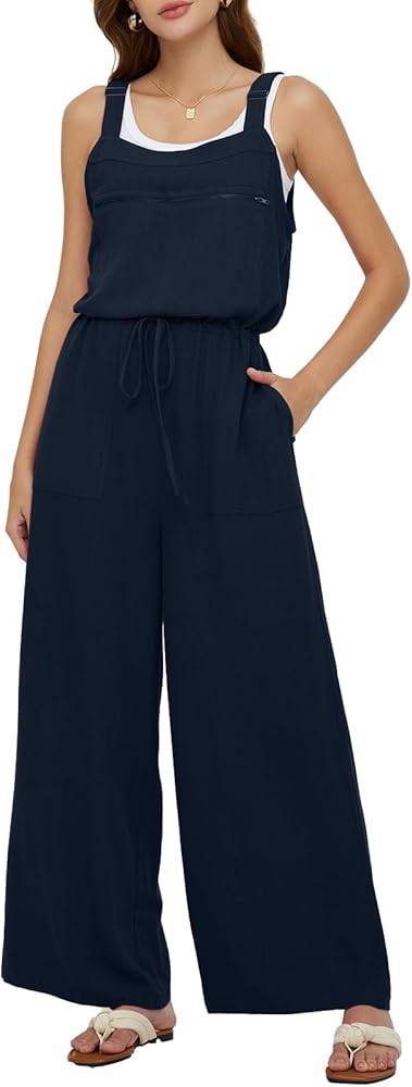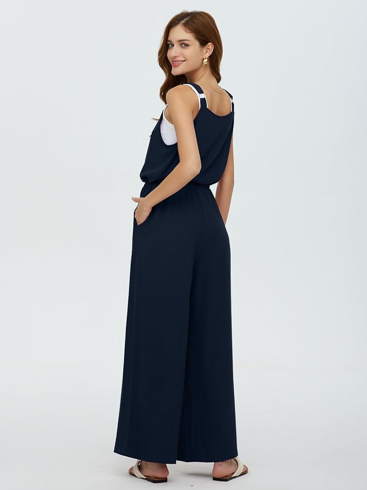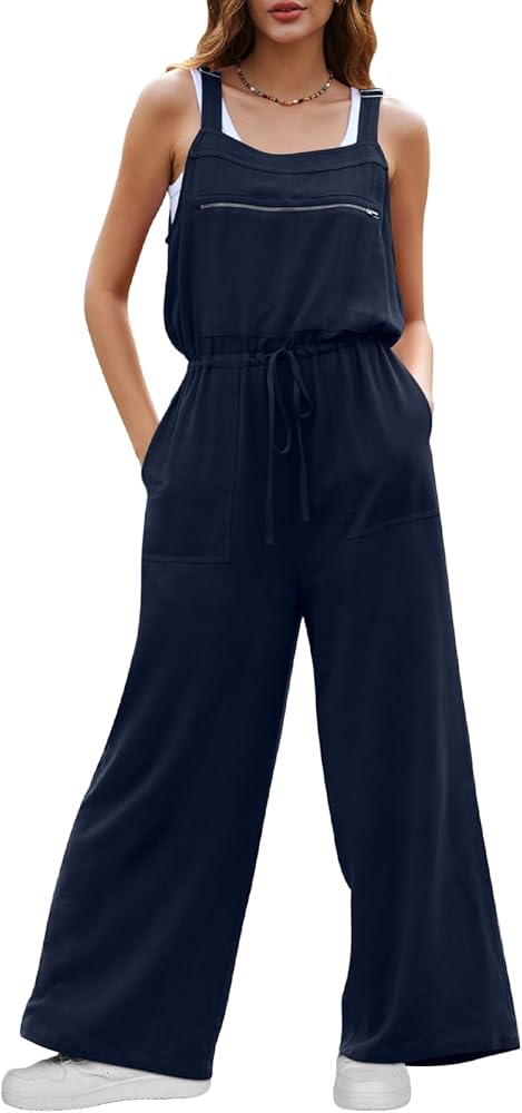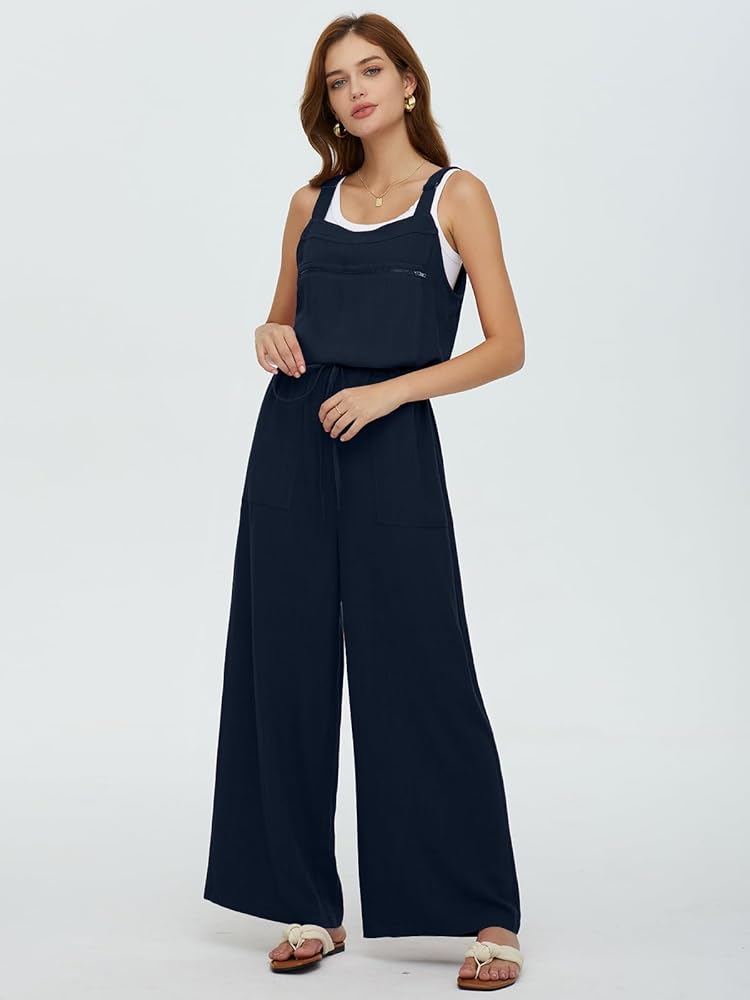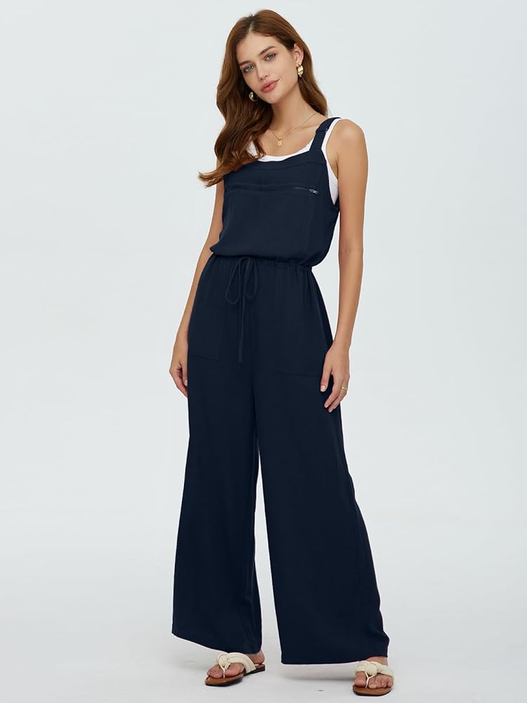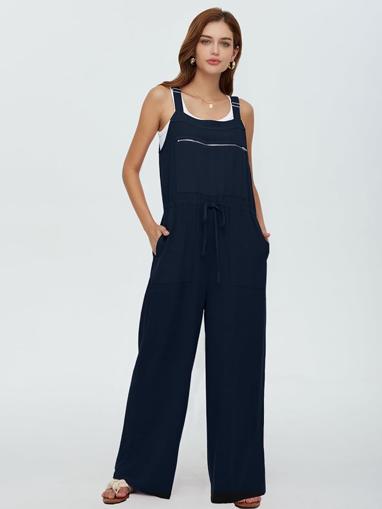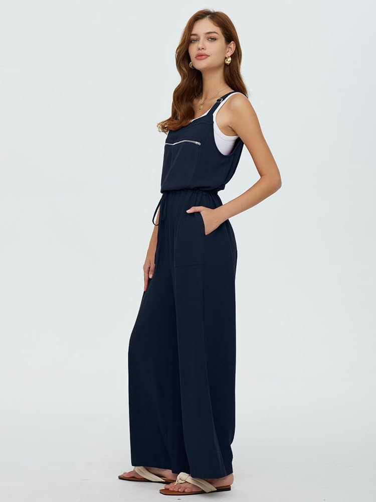 [أبرز التصميم] فائق النعومة ومريح ولكنه مزود أيضًا بتفاصيل متميزة بما في ذلك خط العنق المربع مع أشرطة بإبزيم قابلة للتعديل، وخصر برباط، وملاءمة ساق مستقيمة. كما أنها تحتوي على جيوب بسحاب عند الصدر، ونمط بلا أكمام وقصة غير رسمية فضفاضة.