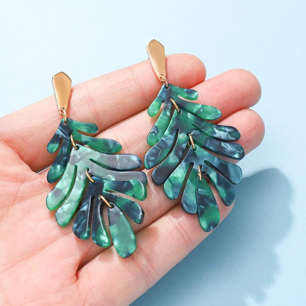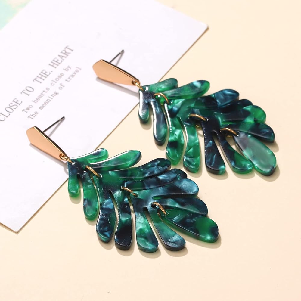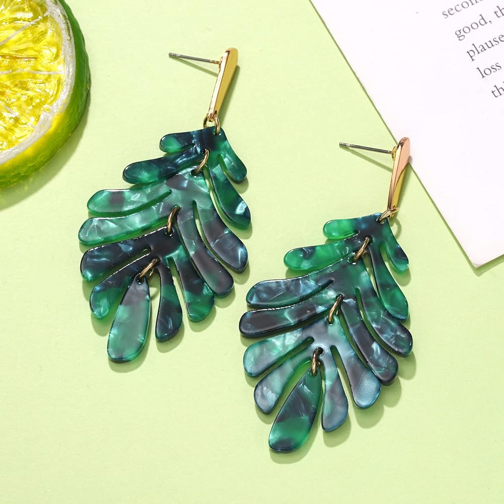• 【TRENDY ACRYLIC EARRINGS】 — This listing is for a pair of leaf earrings. A large green tortoiseshell monstera leaf charm hangs from a vertical bar ear post made from gold plated brass. They are beautiful statement earrings and very lightweight, so you can wear these beauties all day long. Fashion acrylic leaf dangle earring Jewelry are trendy jewelry of spring-summer 2020. Perfect for beach holidays or summer events.