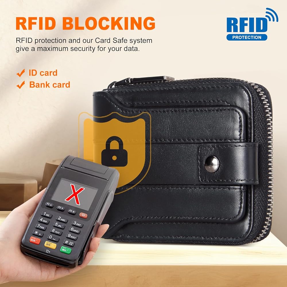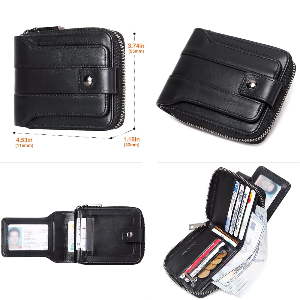 محفظة بسحاب للرجال، سحاب من الجلد الطبيعي حول المحفظة RFID تحجب نافذة الهوية ثنائية الطي، محفظة بسحاب مع جيب للعملات المعدنية
