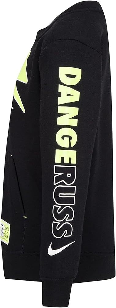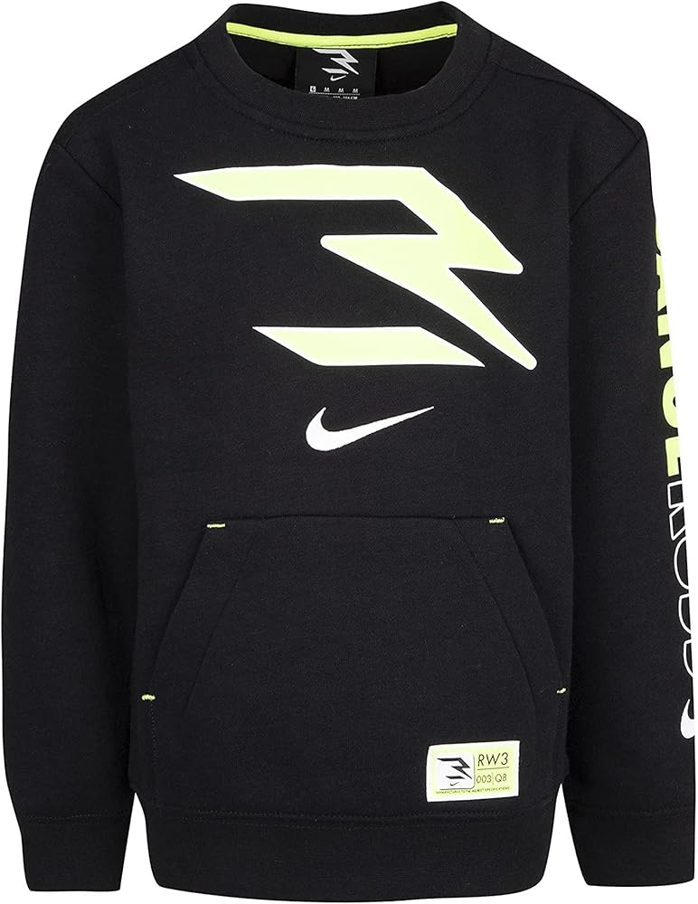 Russell Wilson's 3BRAND brings sport, music and fashion together in an on-trend sportswear brand that inspires us to be better, do more, and give back. 3BRAND believes the mind, body and soul combine to make dreams come true. A percentage of all 3BRAND sales are donated to the Why Not You Foundation, Russell and Ciara's nonprofit organization dedicated to fighting poverty through education, empowering youth to lead with a why not you attitude. RW3 Signature Crew (Little Kids). Long sleeves. Soft sueded fleece. Crewneck. Ribbed collar. Kangaroo pocket. Elastic, ribbed hem and cuffs. Dangeruss print on sleeve. Nike x 3BRAND logos. 60% cotton, 40% polyester. Machine wash. 3BRAND Kids RW3 Signature Crew (Little Kids) 9570563