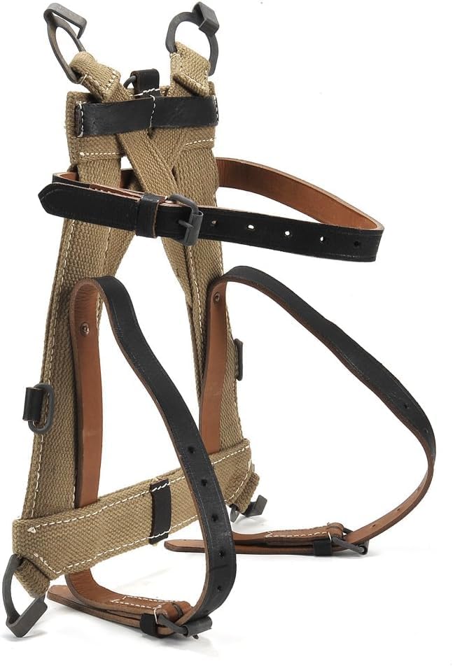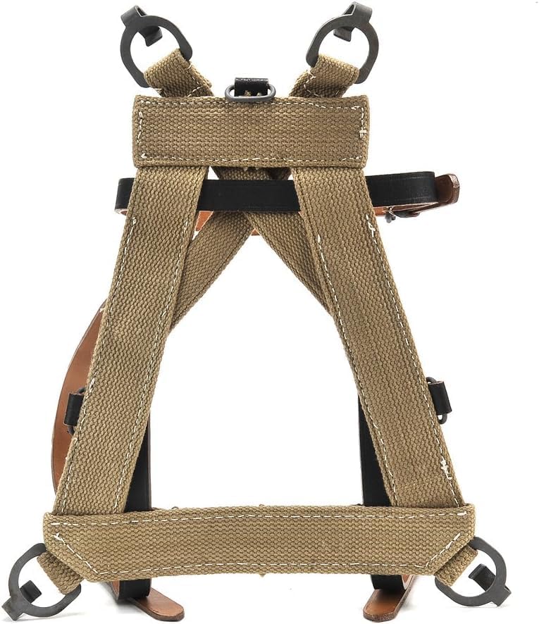 High quality reproduction canvas and black leather strapped A-Frame as used by the German . The A-frame was introduced in 1939 at the same time as the combat Y-straps and was used to carry a soldiers combat kit such as the zelt quarter, mess tin and assault pack which would hold a solders rifle cleaning kit, spare socks and combat rations. There is also a square ring to the top and to either side to secure a rolled up blanket or greatcoat to the frame although this wasn't used all to often. There are many original photos of soldiers in combat who have used the A-frame to secure their gas mask canister with the zelt rolled around it, Many soldiers would throw away the mask in favour of using the canister to hold more ammunition or rations. The two D rings to the top secure the frame to the Y-straps and the bottom D rings attach to the two spare support straps on the front of the Y-straps securing them both together and to stop the pack moving around too much These Tropical A-Frame with Leather Straps are a perfect accompaniment to your Collection.