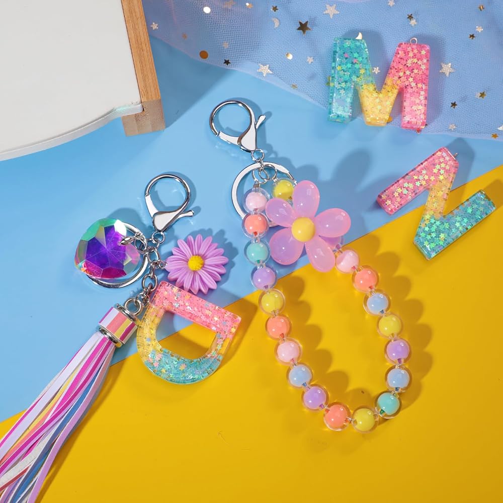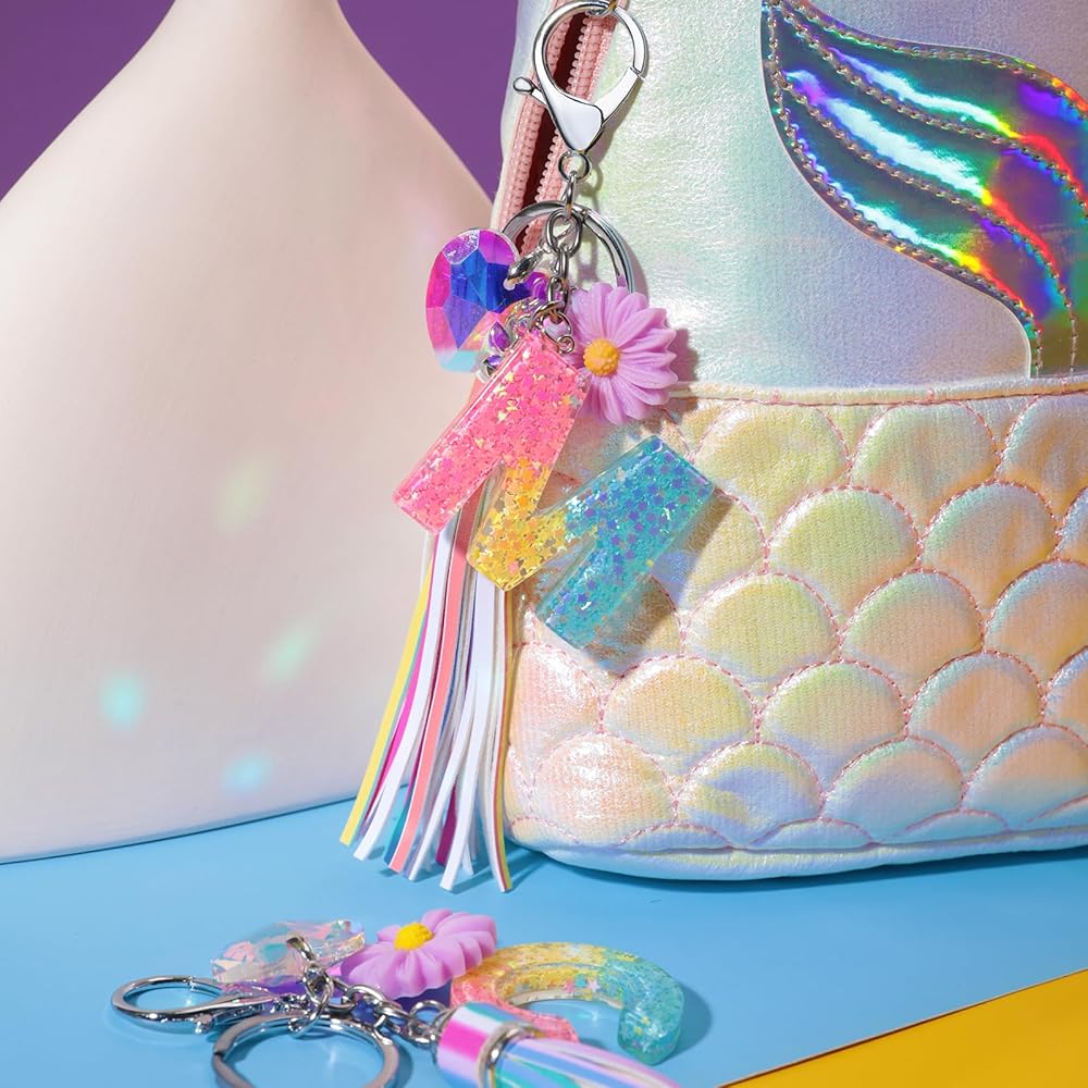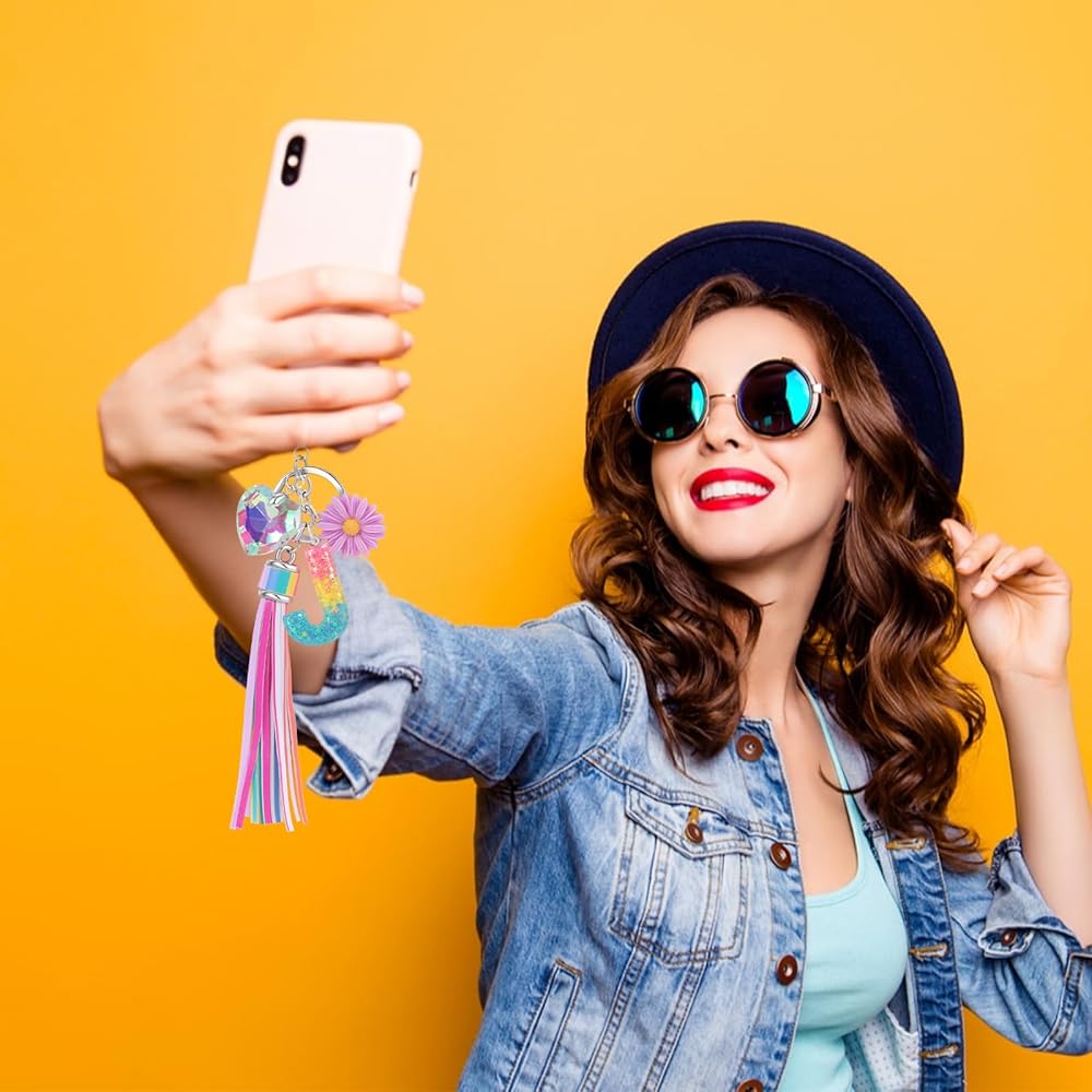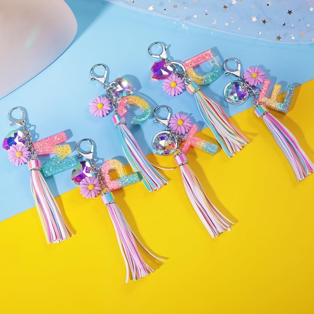 💝【مواد عالية الجودة وآمنة】سلسلة المفاتيح اللطيفة المصنوعة من الراتنج ذات الشرابة مصنوعة من مادة الراتنج عالية الجودة، وحلقة المفاتيح مصنوعة من طلاء كهربائي عالي الجودة من سبيكة الورد، وتضاف حروف الراتنج مع ترتر الحب، لامعة جدًا، مادة الراتنج عالية الجودة. صلابة، لا تشوه، لا كسر.