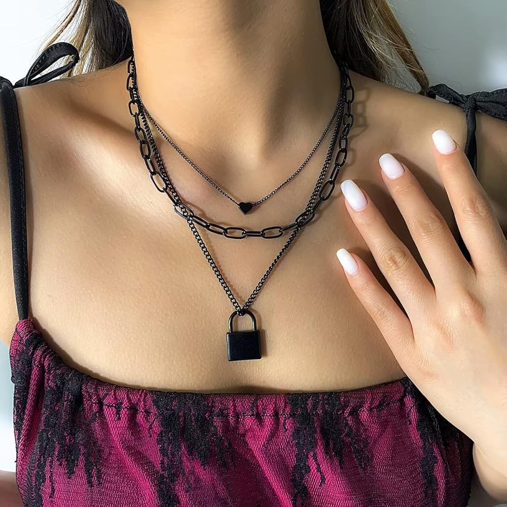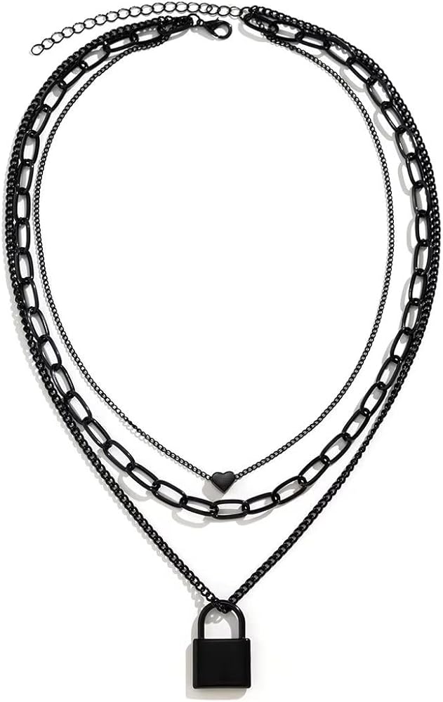 Azusa الشمس الطبقات قلادة الجمالية الشرير المجوهرات قفل ومفتاح سلسلة سميكة القلائد قفل سلاسل القلب الطبقات قلادة للنساء الرجال الفتيات مجوهرات منفعل - أسود