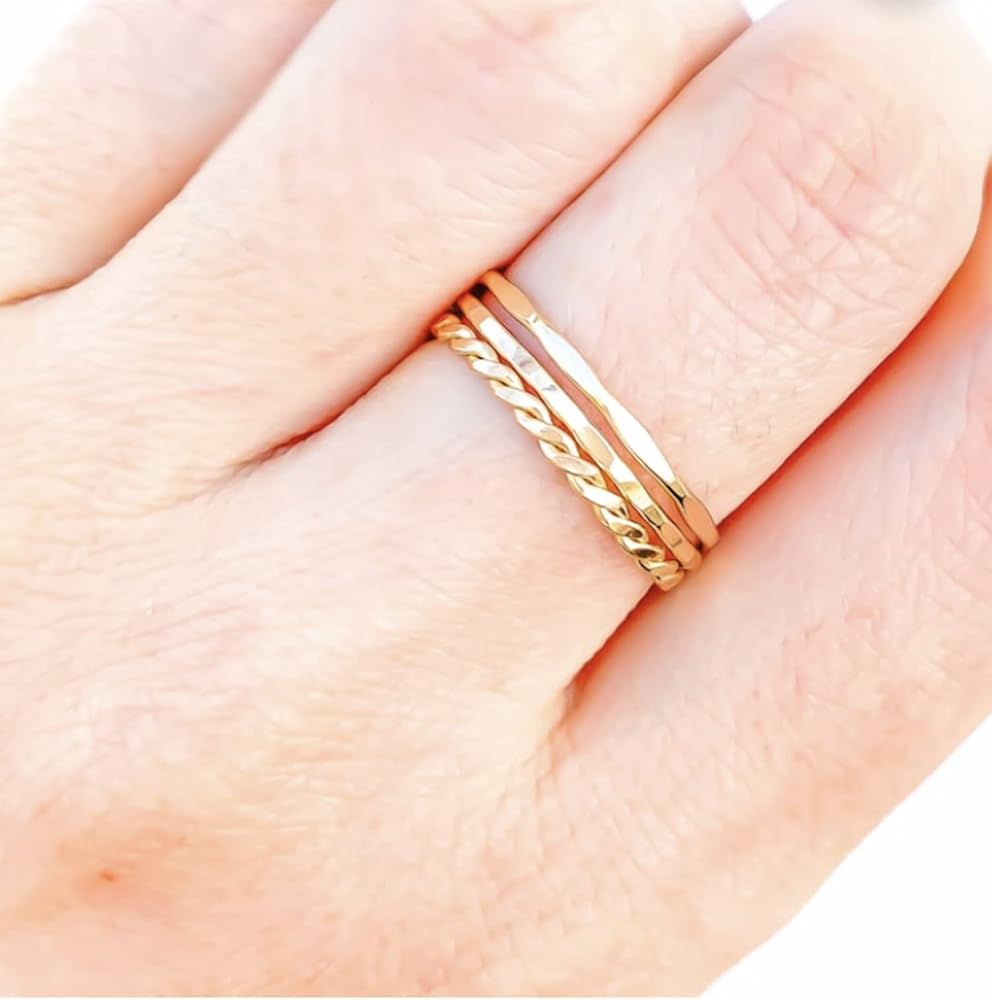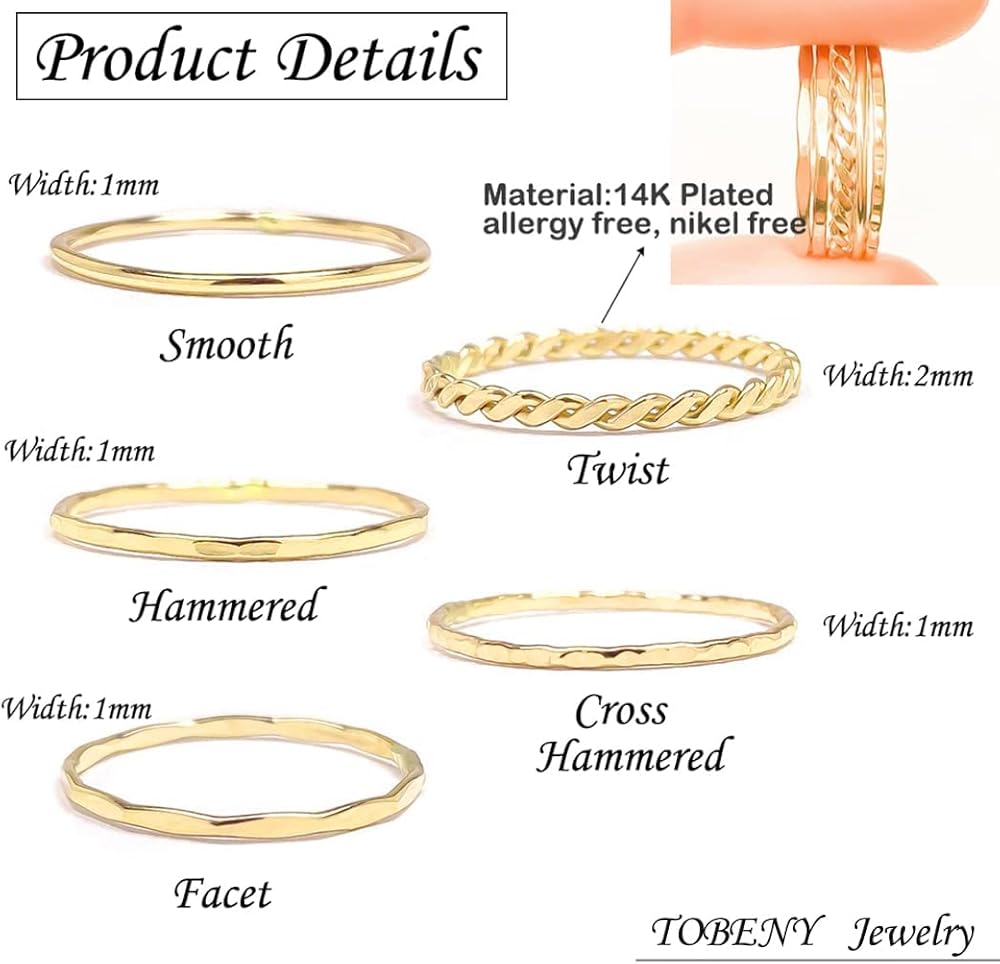 حلقات مطلية بالذهب عيار 14 قيراط: حلقات قابلة للتكديس مطلية بالذهب/الفضة/الذهب الوردي عيار 14 قيراط؛ مصنوعة من مادة نحاسية مؤهلة وتأخذ عملية مطلية رائعة. لا يسبب الحساسية ولا يتآكل أو يصدأ أو يتلطخ بسهولة بالماء. الجزء العلوي لامع وخالي من النيكل. متانة عالية. مناسب للأصابع الحساسة.