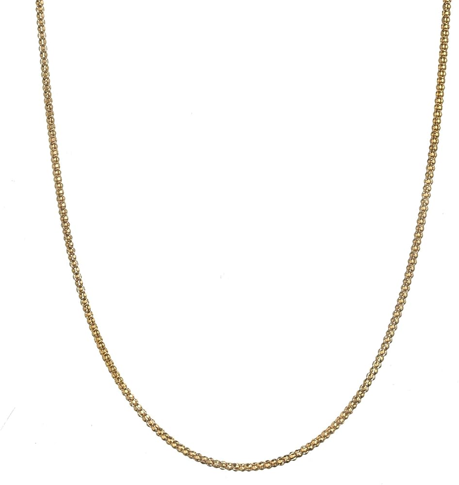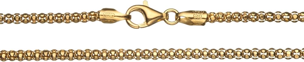 This shimmering 2.3mm popcorn chain necklace is sturdy and durable, yet it's lightweight and comfortable to wear. The high quality chain is made in Italy with the finest craftsmanship, using only genuine solid .925 sterling silver, with a shimmering 18K yellow gold flashed color. Each chain is stamped 925 and ITALY for authenticity. Our chains are imported directly from the Italian manufacturer, allowing us to offer you the lowest prices. This chain is secured with a heavy duty lobster claw clasp, which is more durable than the standard spring ring clasp used in other chains. Available in various sizes between 16" - 30". Select your desired length from the drop down list.