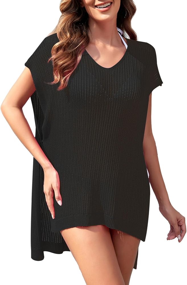 ميزات تغطية ملابس السباحة النسائية، أكمام قصيرة، رقبة على شكل حرف V، مجوفة للخارج، حاشية مقسمة جانبية غير متماثلة، طراز كبير الحجم، غطاء ملابس سباحة علوي، كروشيه، طول صغير