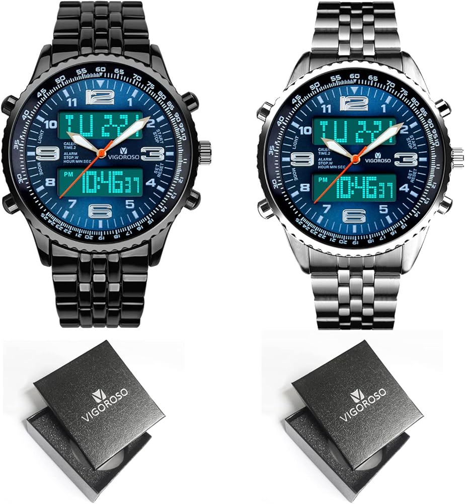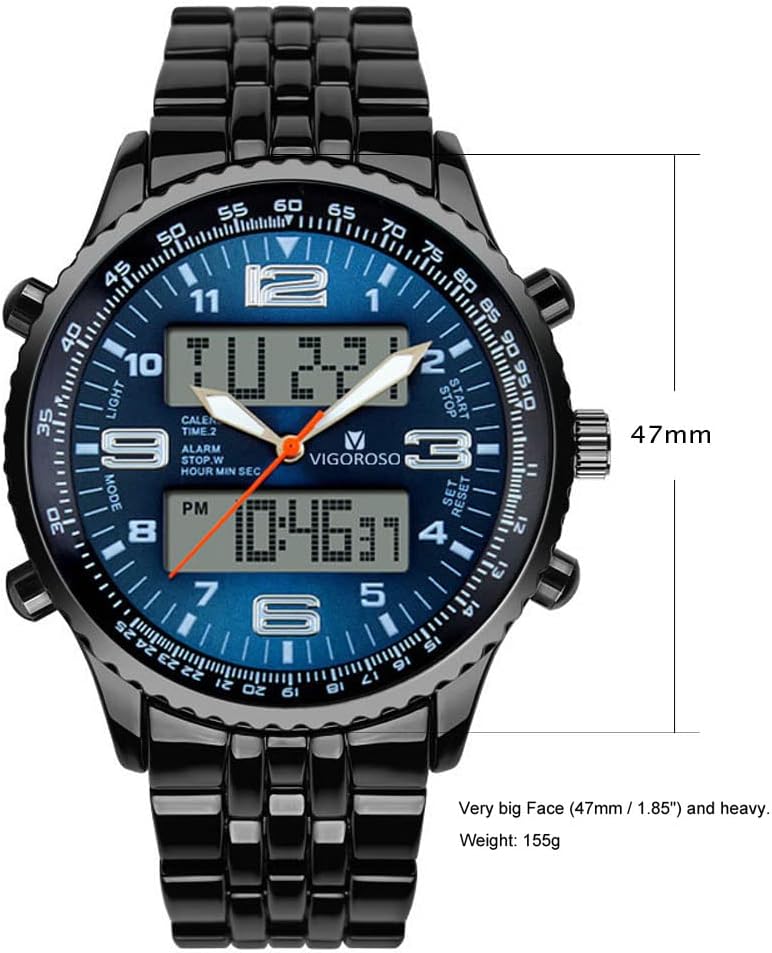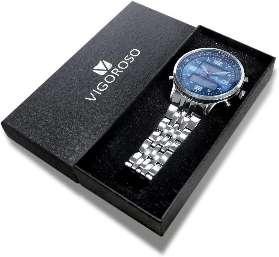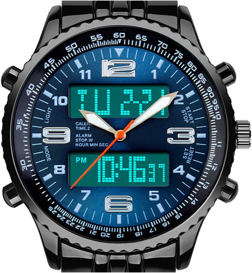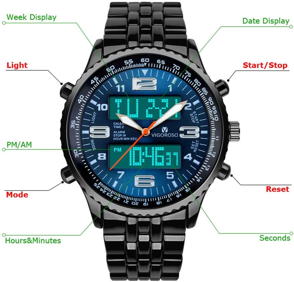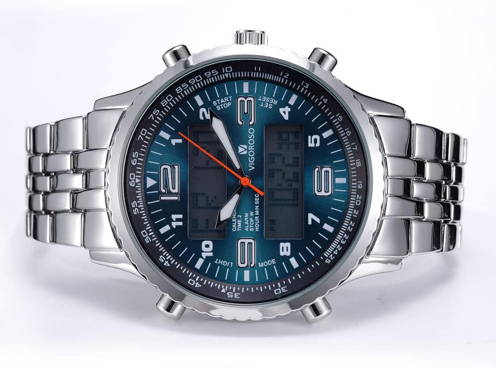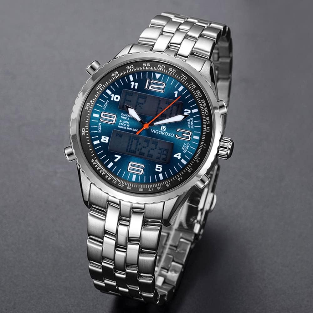 - VIGOROSO Men's LED Analog Digital Date Week Sports Outdoor Steel Blue Dial Watch