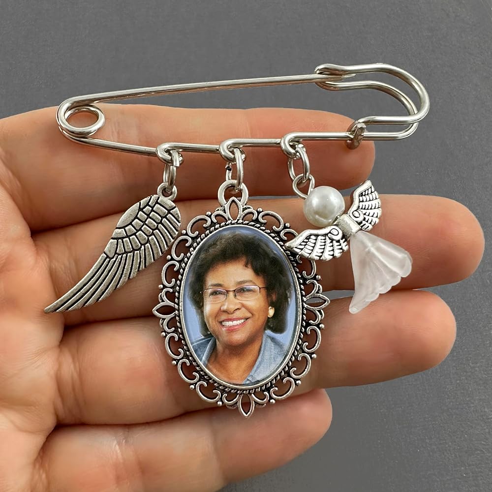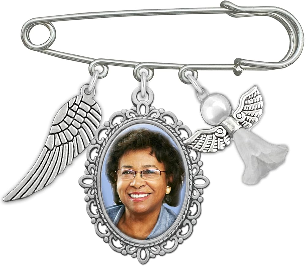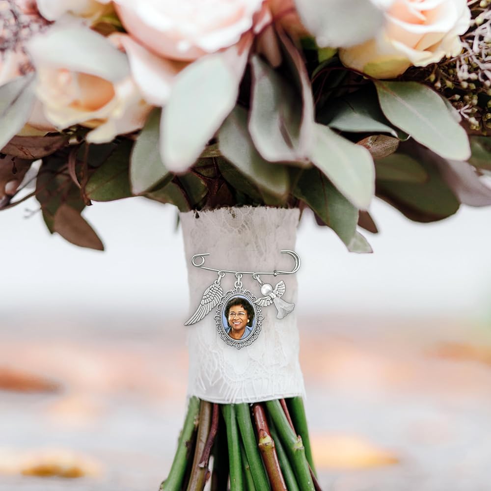 Easily personalize your wedding bouquet or boutonniere - add your own photo to this unique memorial wedding photo pin featuring a pearly guardian angel charm and wing to symbolize a missed loved one