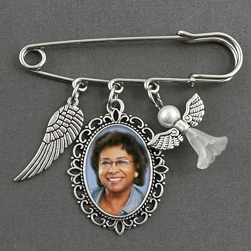 This versatile memorial wedding pin can be worn by the groom, mother or father of the bride, groomsmen, or used as a bouquet charm. Add a special touch to your wedding day and memorialize a missed loved one while holding them near as you walk down the aisle. Everything you need to easily add your photo to this unique memorial photo wedding pin is included with your purchase.