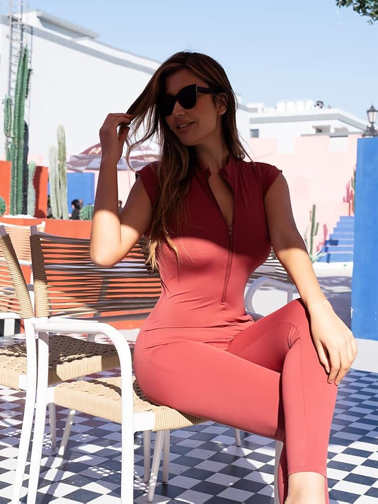 - السمات: رقبة عميقة على شكل حرف V، بدون أكمام، سحاب، سراويل طويلة، ضيقة، خصر مرتفع، بدلة قطعة واحدة، رومبير وبذلة.