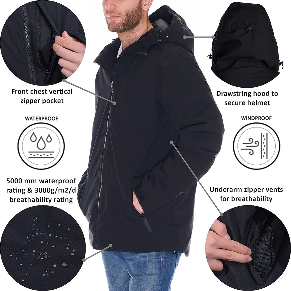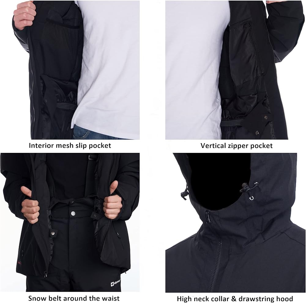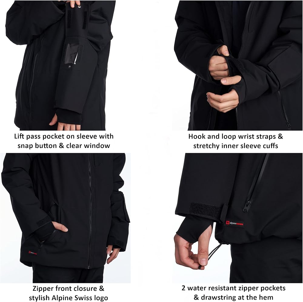 Men's Waterproof Ski Jacket By Alpine Swiss Product Features: Polyester MULTIPURPOSE SNOW COAT – The Alpine Swiss men's ski jacket is the perfect winter jacket suitable for all kinds of weather such as wind, rain, and snow. Ideal for all winter activities and outdoor sports like skiing, snowboarding, hiking. Use the size chart in the images to find your best fit. WATERPROOF & WINDPROOF – Our ski jacket is waterproof and windproof which is essential while you're out in the snow or rain. Made from a 100% polyester shell, fill and lining which provides warmth and keeps you dry with a 5000mm waterproof rating to protect you in wind, snow, and moderate to heavy rain. The sleeves have hook and loop straps to help keep in warmth and keep out wind. BREATHABLE – Our jacket is designed to keep you warm without overheating, a breathability rating of 3000 g/m²/d ensures that the material of the jacket is both water resistant and breathable. Designed with underarm zipper vents to allow hot air to escape your jacket and let cool air in without having to unzip the front of your jacket. SMART DESIGN – Stretchy inner sleeve cuffs with thumb hole will prevent your sleeves from riding up, keep your hands warm, and keep out snow. The left sleeve has a convenient lift pass pocket on the lower arm above the wrist to easily wave it near sensors. The inside has an elastic snap button snow belt that goes around your waist and adheres to your body to prevent snow from entering your jacket. Front zipper closure and a drawstring at the hem for a snug fit. FUNCTIONAL – Quick access vertical front zipper pocket, perfect for a phone. Two front zipper pockets, one large interior mesh slip pocket, and one interior vertical zipper chest pocket. The high neck collar has adjustable drawstring around the hood which is large enough to fit over your helmet. The hood also has an addi
