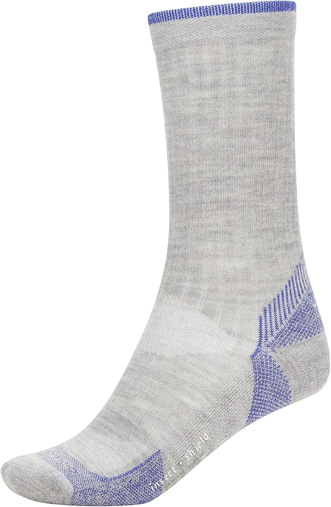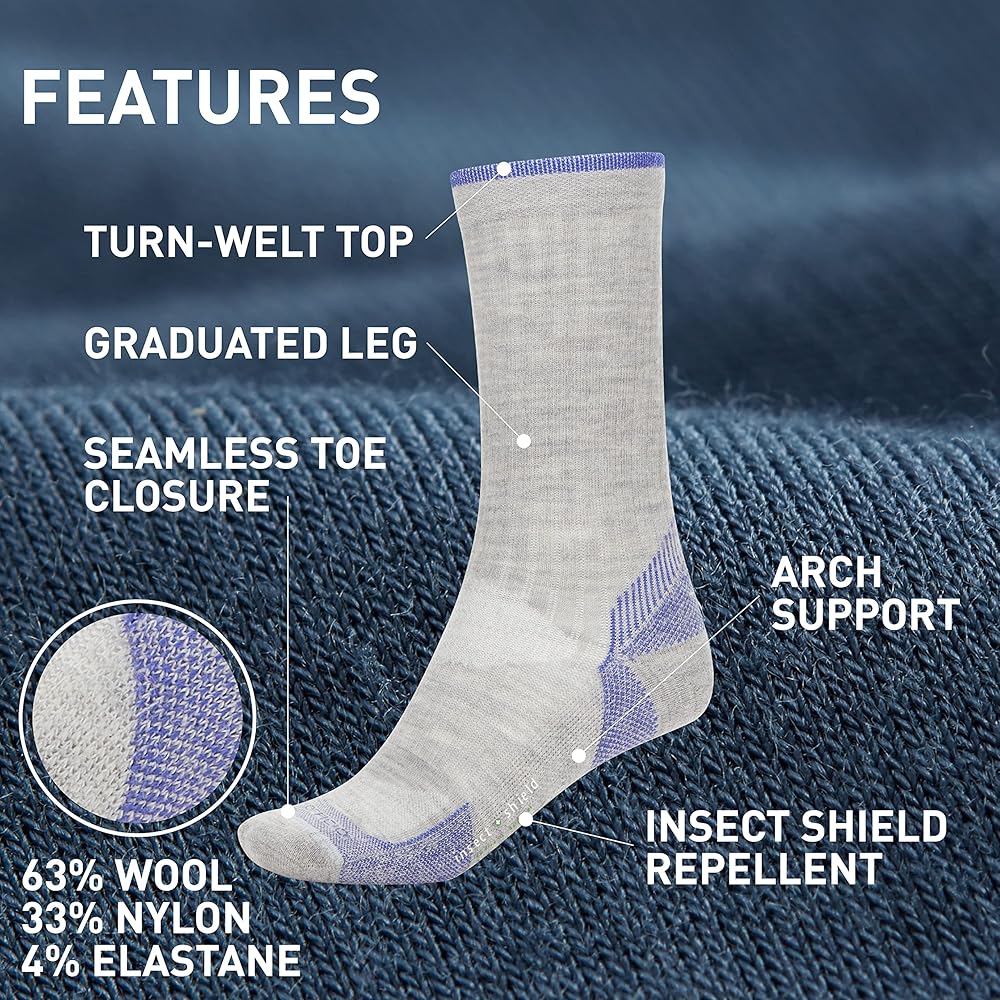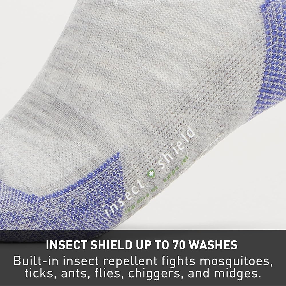 Engineered with built-in arch support, ExOfficio Women's BugsAway Solstice Canyon Crew Socks provide dependable comfort on the trail, during travel, or as you're trekking through a dense forest. Knit from a breathable wool/nylon blend with spandex throughout for extra retention, they wick moisture away from your skin and keep your feet dry. The turn-welt top keeps these socks for women in place as you're hiking, running, and jumping over trail debris, while a seamless toe closure reduces irritation during long days of wear. Whether in the backwoods or the backyard, Insect Shield technology helps keep you protected with built-in invisible, odorless insect protection that repels mosquitoes, ticks, ants, flies, chiggers and midges (no-see-ums). The active ingredient in Insect Shield products is so tightly bonded to the fabric fibers that it retains effective repellency through 70 washes.