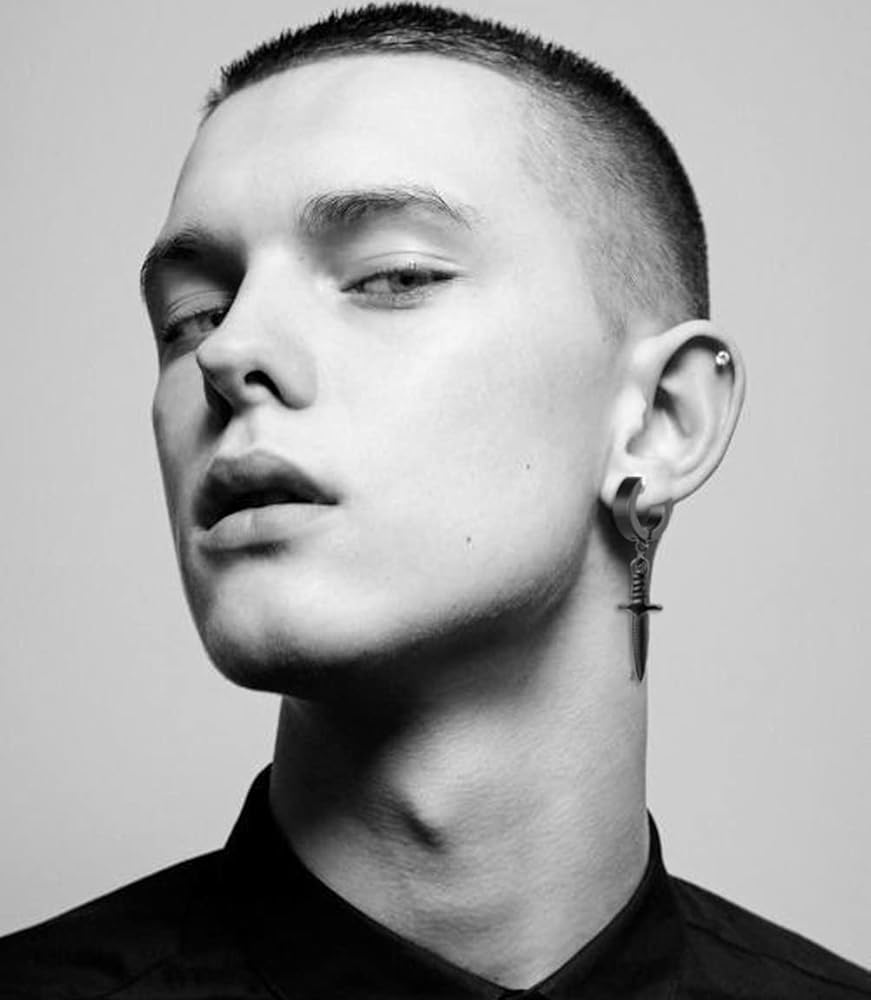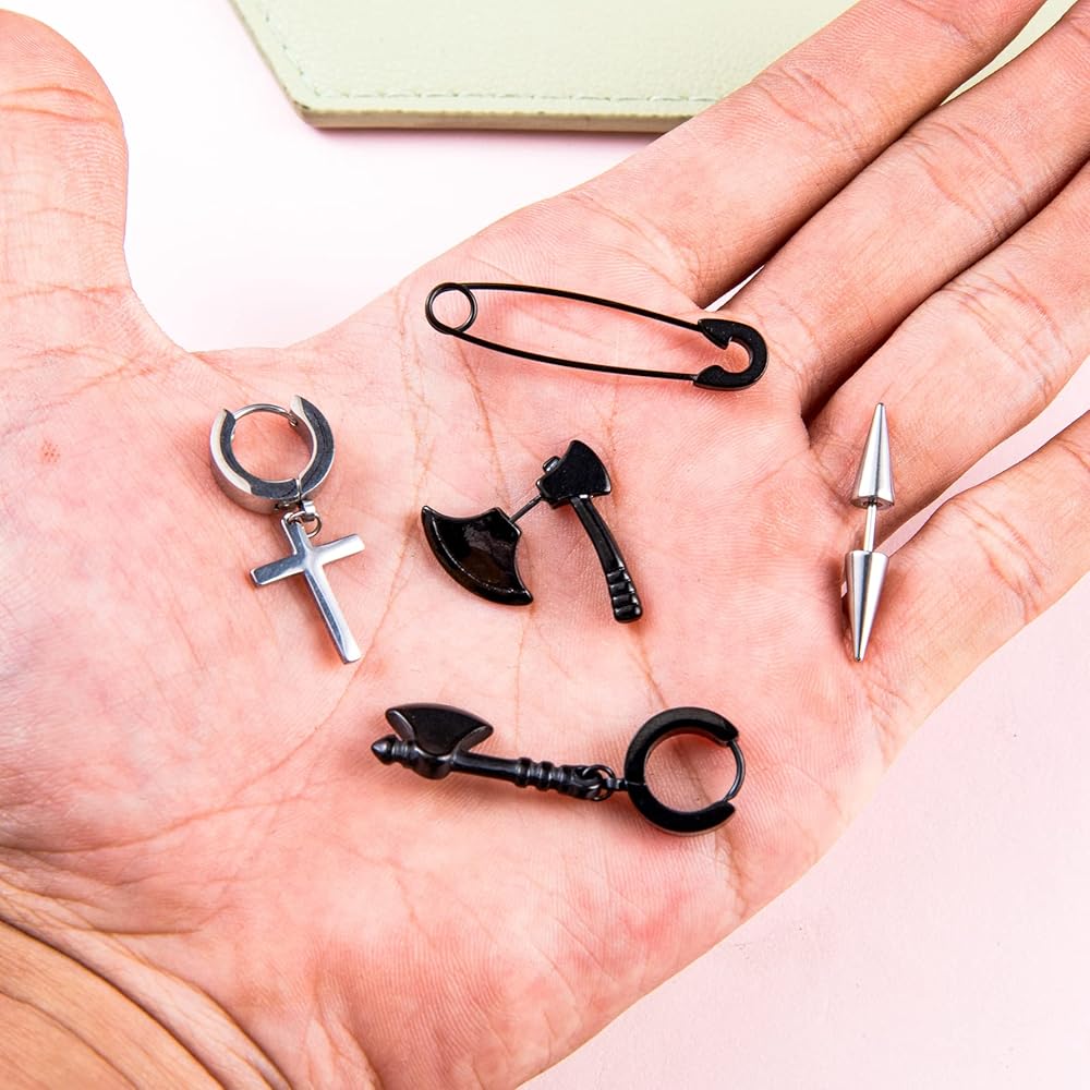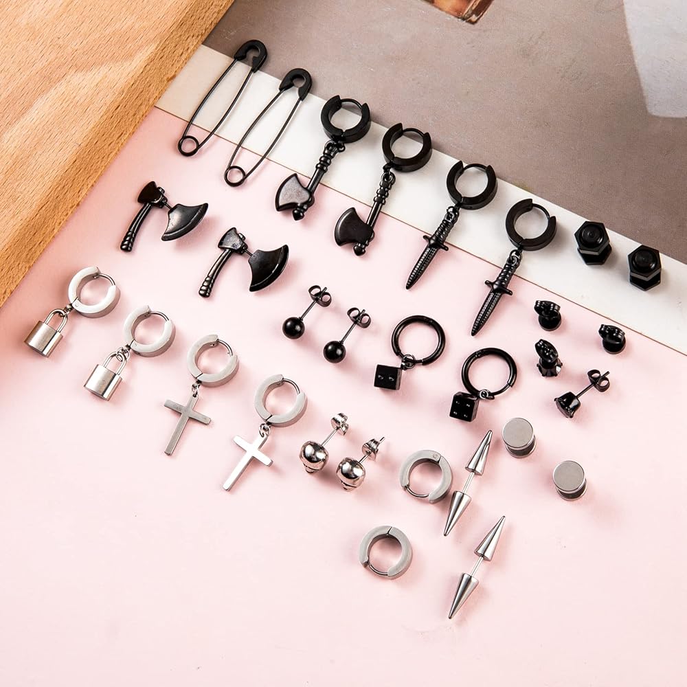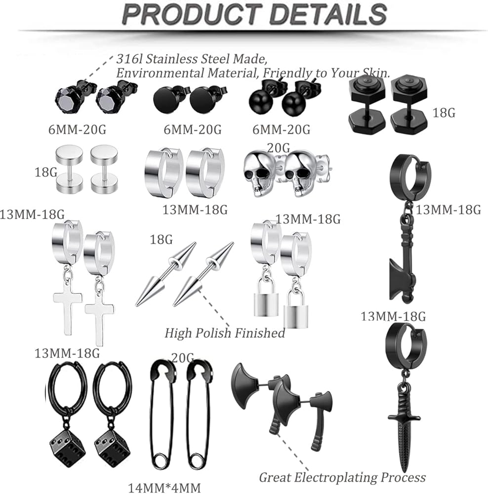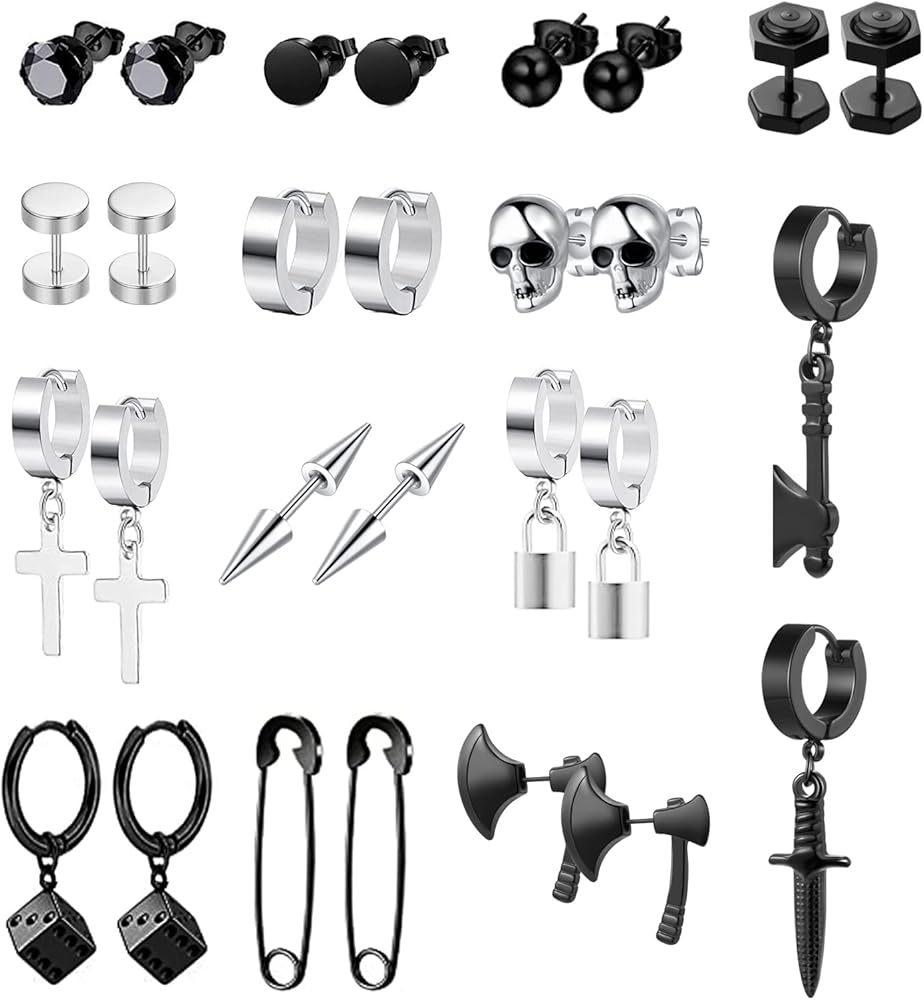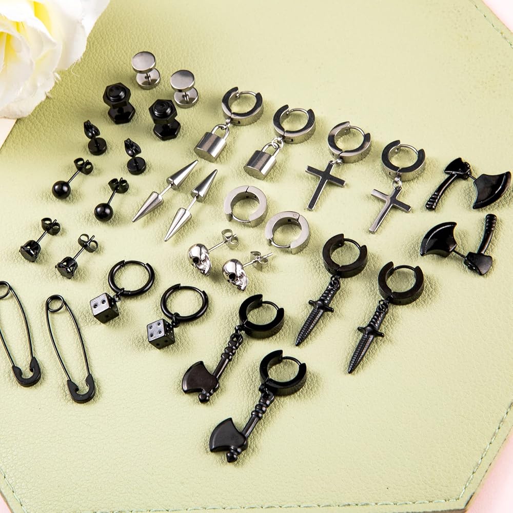 YOVORO 14 Pairs Black Earrings for Men Stud Earrings Huggie Hoop Earrings Set for Unisex Cross Dangle Earrings Skull Axe Punk Earrings