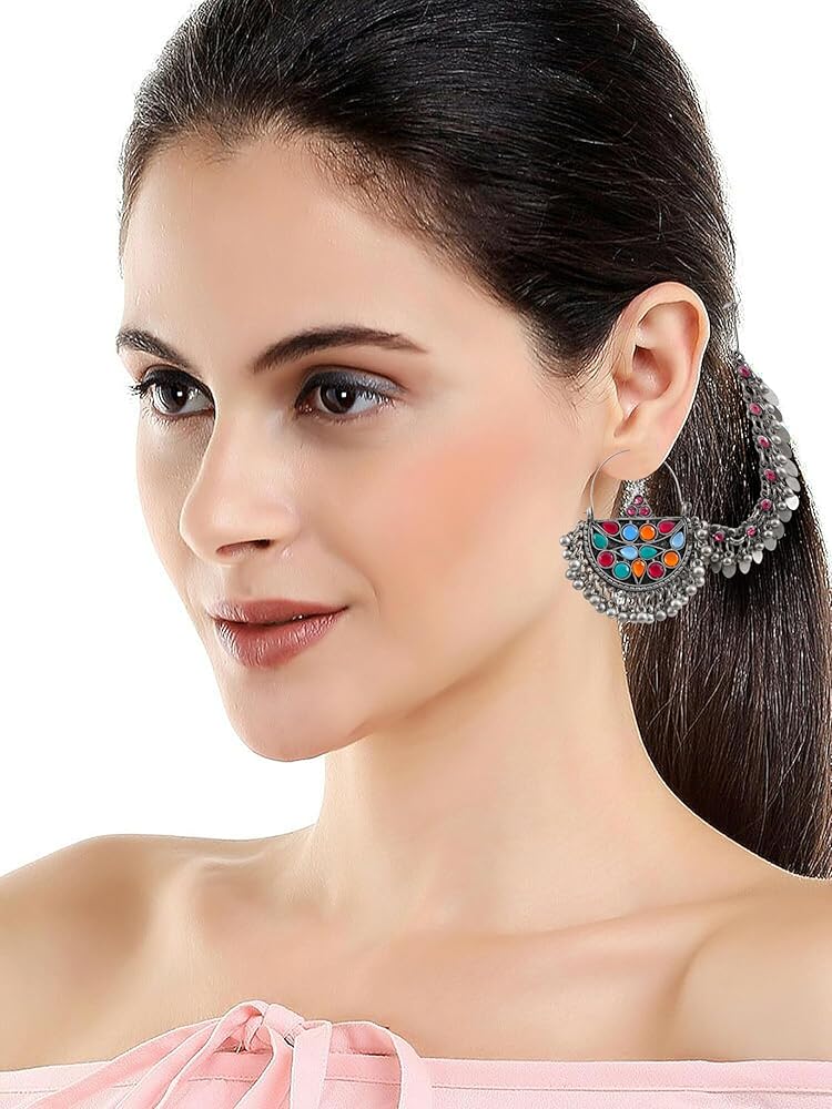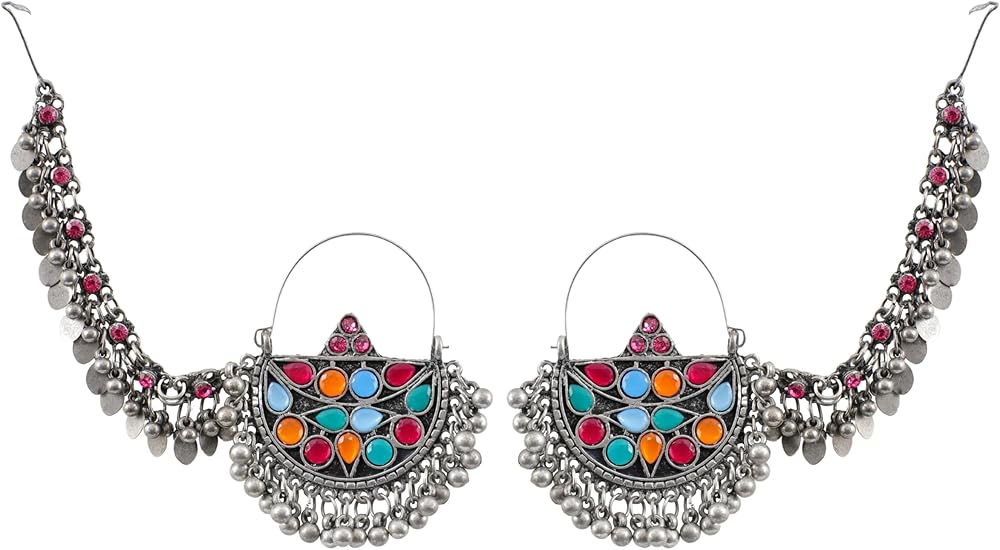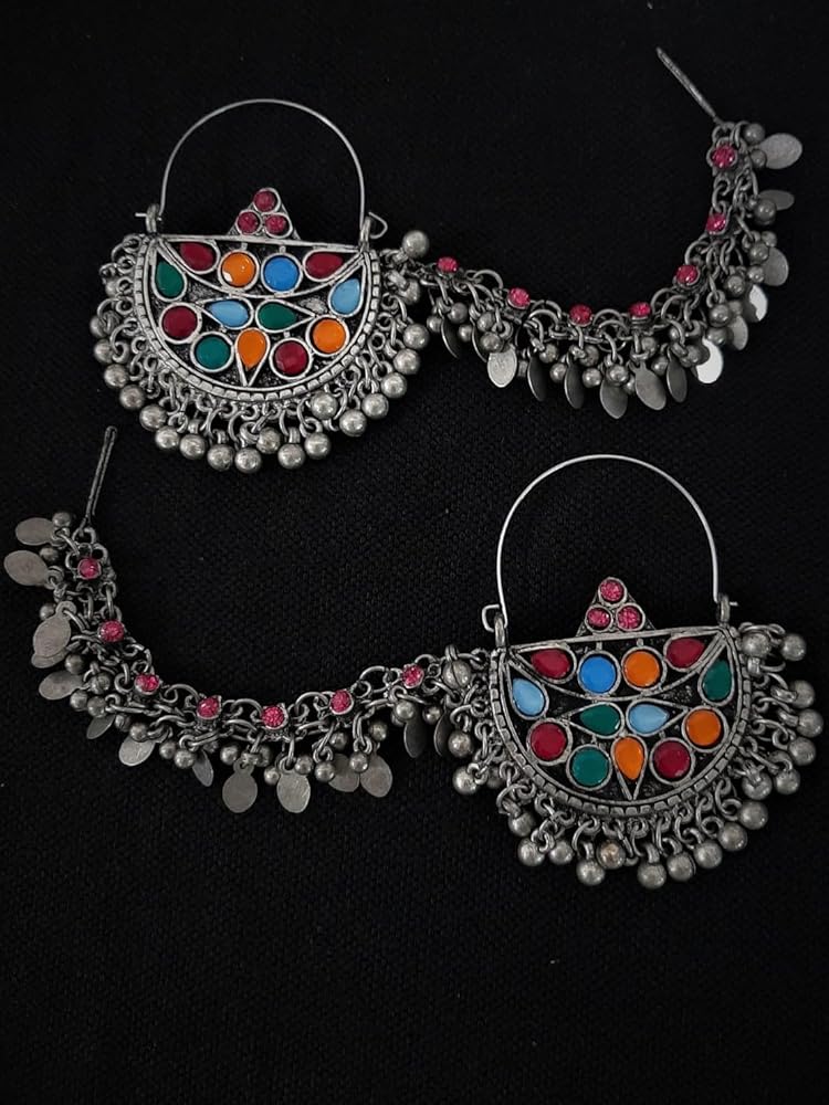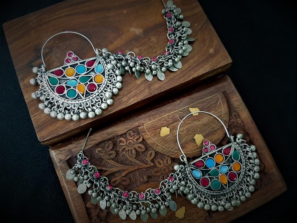 الهندي التقليدية الفضة المؤكسدة الخرز أزياء عرقية بوليوود مانغ تيكا باهوبالي أقراط سلسلة حمراء