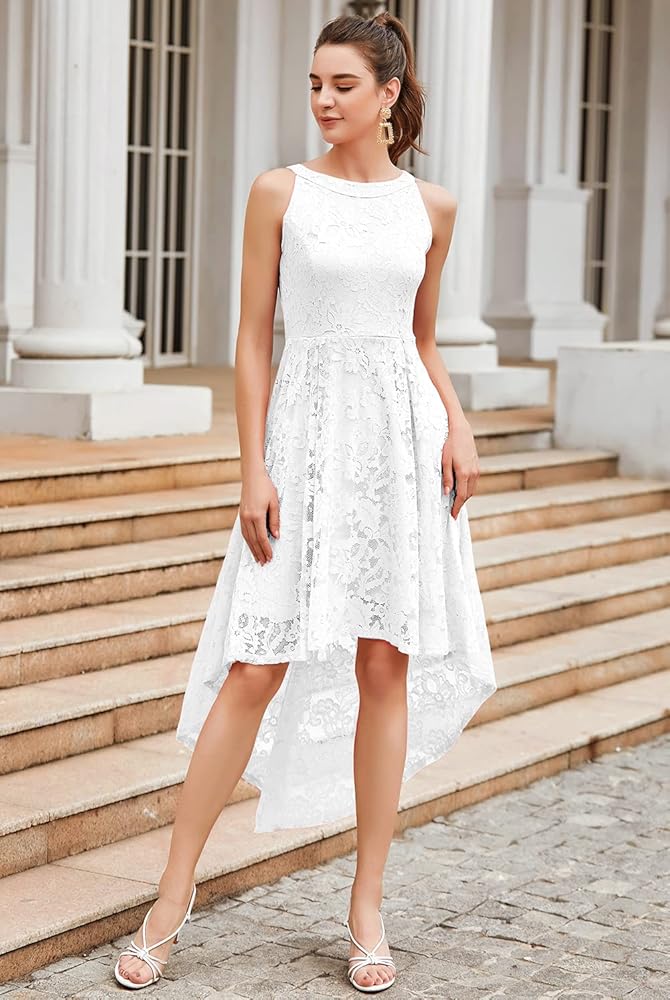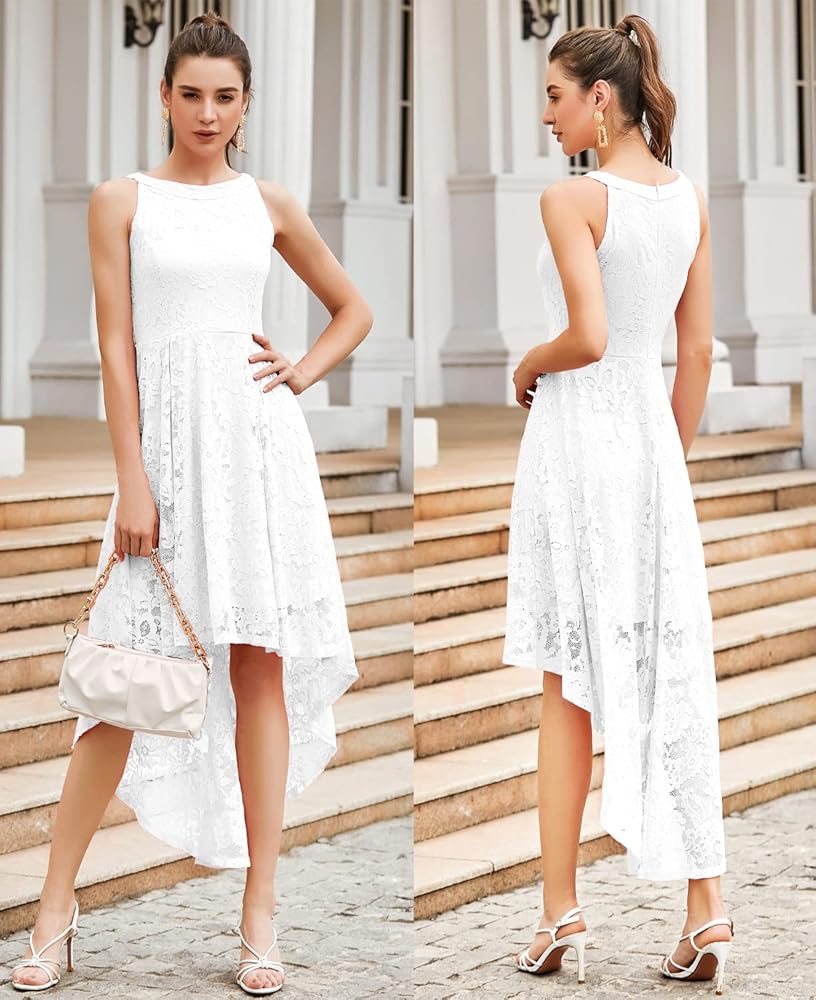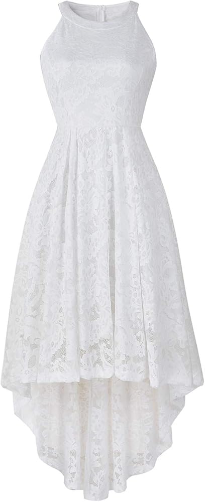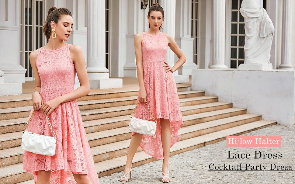 - المزايا: رقبة على شكل رسن، بدون أكمام، نمط زهور من الدانتيل، سحاب مخفي في الخلف، قصة مرتفعة ومنخفضة