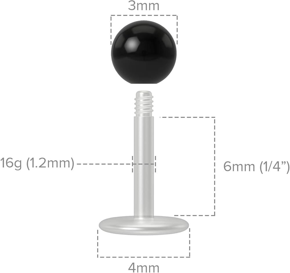 SPECIFICATIONS - Length: 6mm. Gauge: 16g. Color: black. Ball End: Ball 3mm. These 16g bioflex labret are designed and tested for quality. Get the most out of your piercing with these 16g labret bioflex