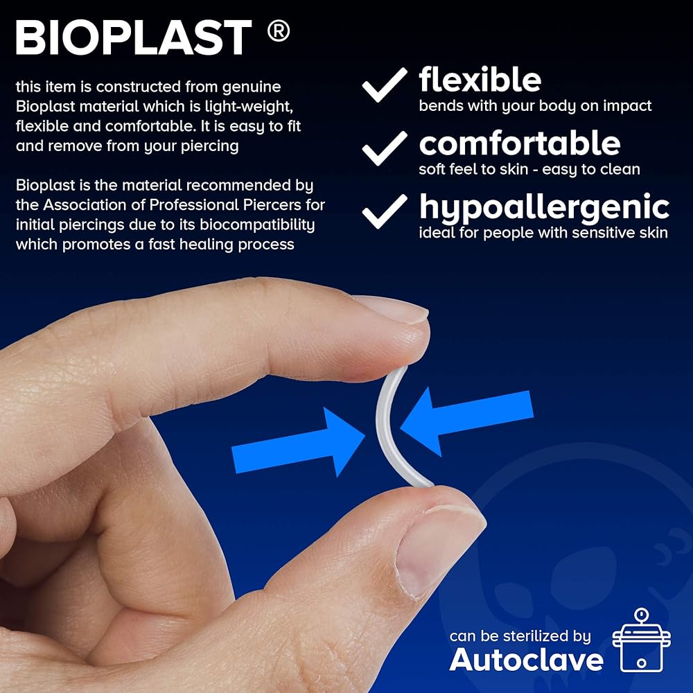 PIERCING STYLE - These bioflex labret 16g can be used for anti-tragus, cartilage (ear), conch, forward helix, helix, labret (lip), lobe, medusa (philtrum), monroe, snake bites, spider bite, tragus, triple forward helix, vertical tragus piercings. Package contains 2 x bioplast labret 16g
