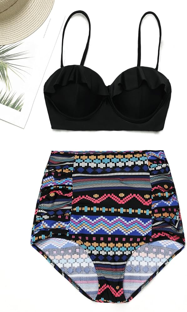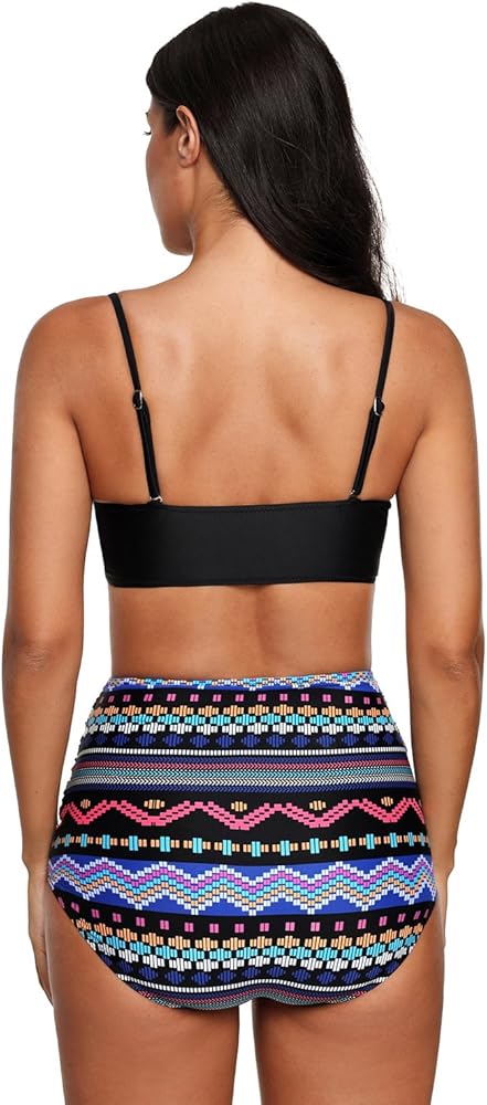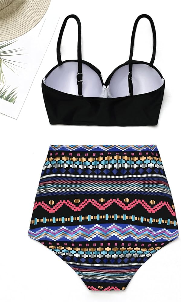 نمط جديد لطيف فريد الجدة أحمر أزرق أبيض وأسود مخطط القبلية طباعة عالية الخصر السيدات سلك الحرة رفع زائد حجم مايوهات للسيدات
