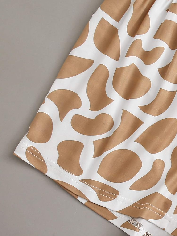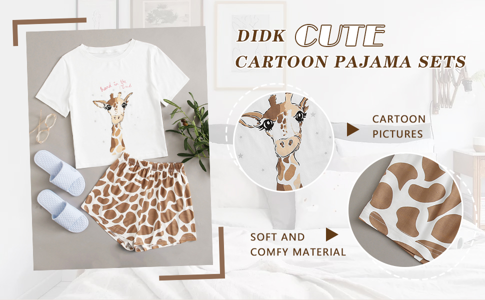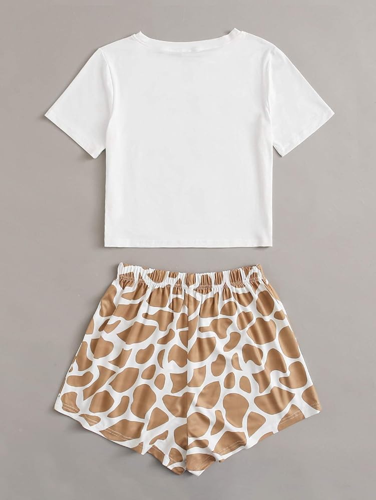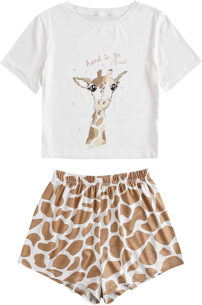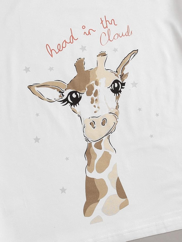 - زرافة كرتونية، مطبوعة، كم قصير، رقبة دائرية