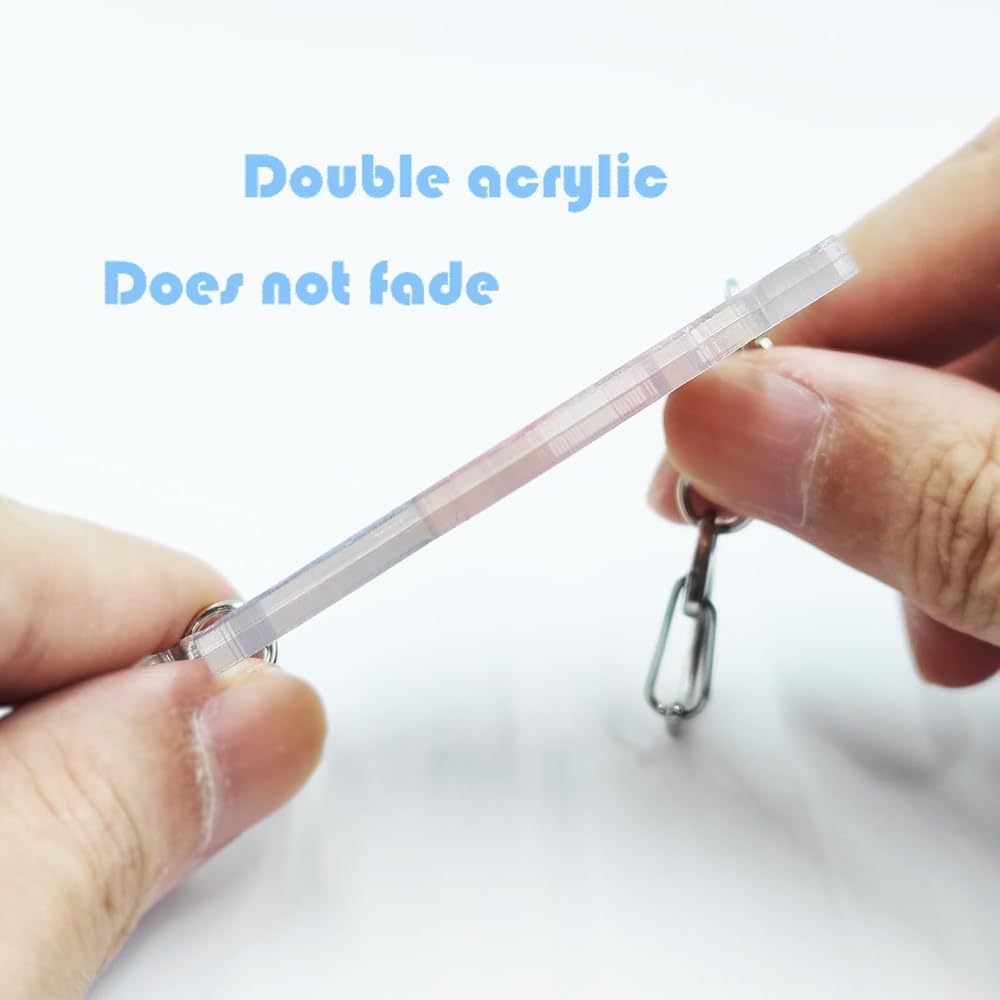 مادة ممتازة: سلسلة المفاتيح مصنوعة من الأكريليك والسبيكة، وهي متينة وغير سامة، والسطح شفاف وناعم وملمس عالي الجودة. يبلغ ارتفاع قلادة الدمية حوالي 8 سم - 10 سم، وتوجد أفلام واقية شفافة على كليهما الجانبين