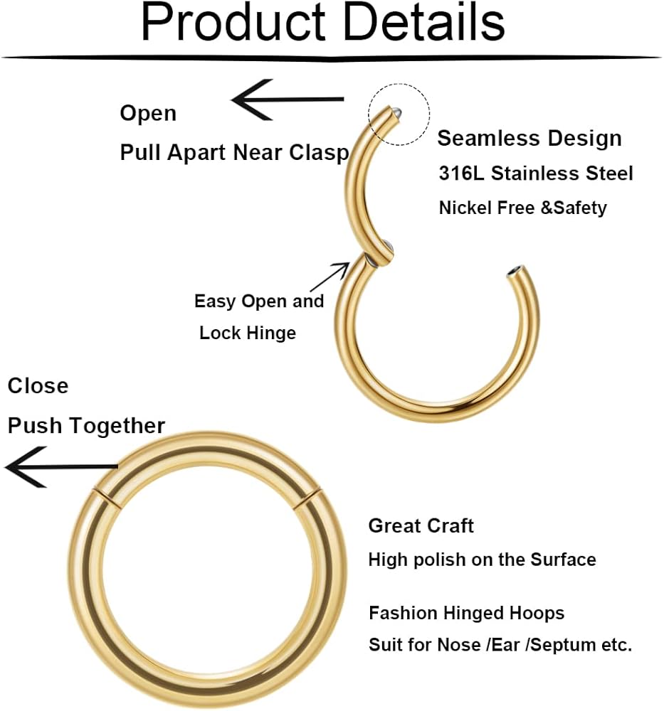 • 【وصف الحجم واللون】: يأتي هذا القرط الغضروف الحلقي بثلاثة ألوان: لون فضي، لون ذهبي، وأسود. 16G /18G لها أقطار داخلية 7/8/10/12/14 مللي متر. نظرًا لمجموعة واسعة من المقاسات، يمكن ارتداء هذا القرط الغضروف الحلقي في أماكن متعددة ويمكن إقرانه بسهولة.