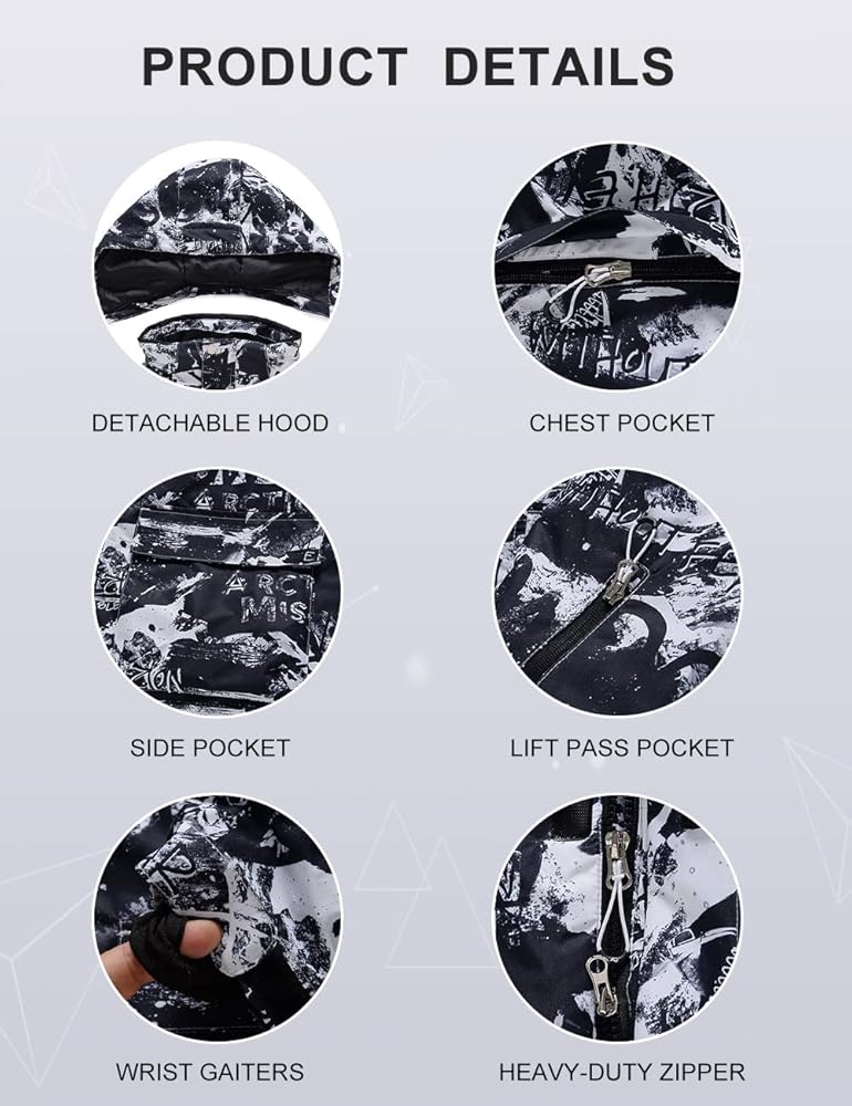 ميزات التصميم للسترة - غطاء رأس قابل للفصل مع رباط قابل للتعديل للحصول على ملاءمة مثالية. 7 جيوب تحمل هاتفك الذكي وغيرها من الضروريات بشكل آمن. تنورة بودرة مرنة غير قابلة للانزلاق مع زر إغلاق قابل للتعديل لمنع الثلج. فتحات الأكمام مزودة بخطاف وحلقة مثالية للاستخدام مع القفازات الأكبر حجمًا.