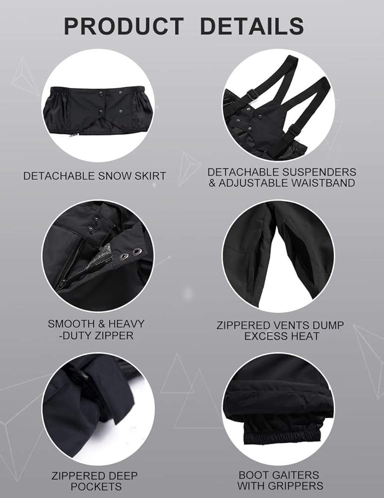 ميزات التصميم للسراويل - أحزمة تعليق مرنة قابلة للفصل والتعديل. تنورة بودرة قابلة للفصل مع سحاب لمنع الثلج. تتميز سراويل التزلج للرجال بوجود جراميق ثلج مدمج، وجرامق حذاء مع سدادة مطاطية قابضة للثلج. فتحتان للفخذ مبطنان بشبكة مع سحابات للسماح للهواء بالدوران في الداخل. فتحتان للفخذ مبطنان بشبكة مع سحابات للسماح للهواء بالدوران في الداخل. جيبان بسحاب يحملان جواز سفر التزلج والهاتف الذكي وغيرها من الضروريات الصغيرة بشكل آمن.