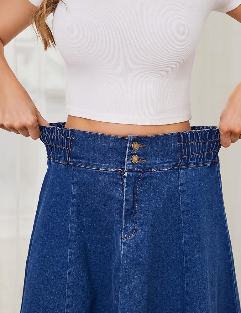 تنورة جينز زرقاء للنساء تتميز بخصر عالٍ، وخصر مرن، وحاشية واسعة، وزر وسحاب للإغلاق، لون ثابت
